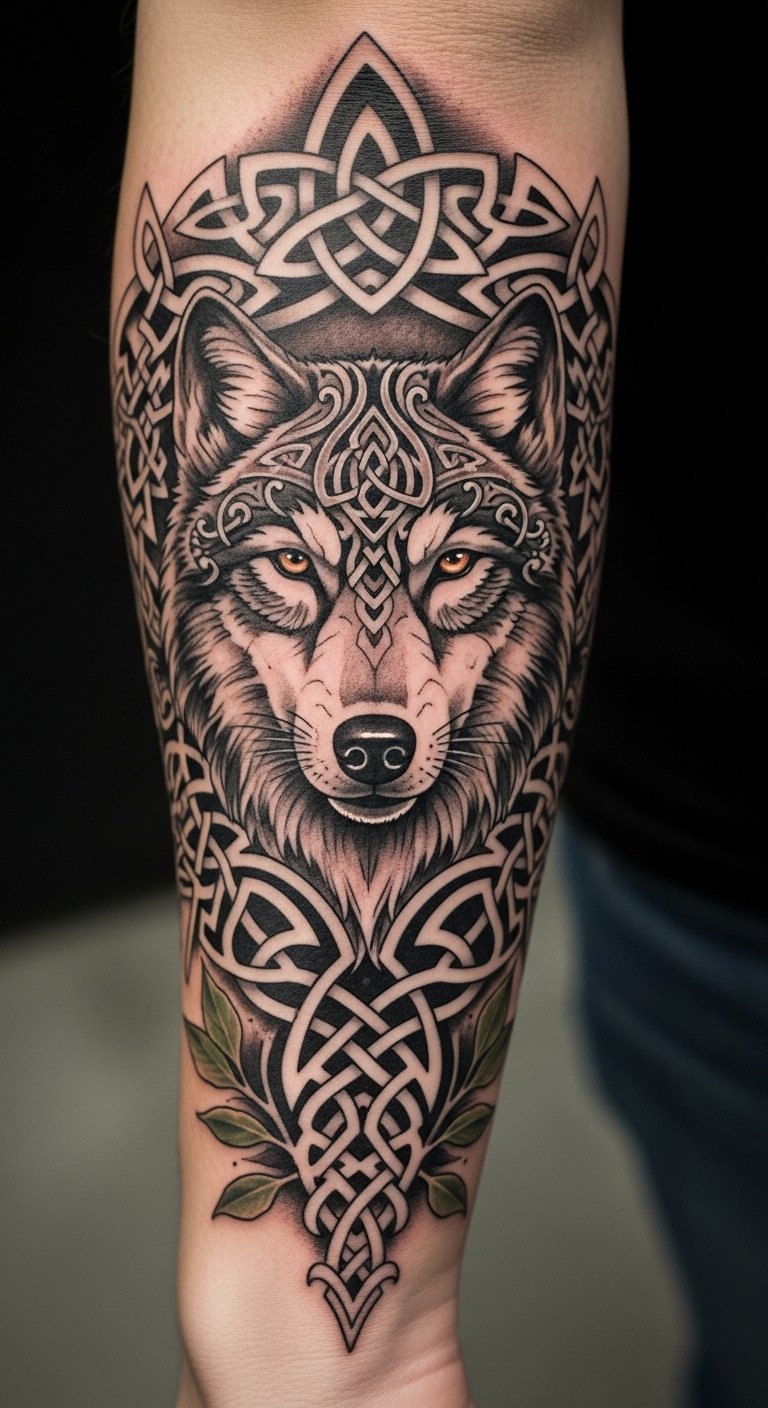 This Celtic wolf tattoo symbolizes loyalty, bravery, and the wild spirit within. Positioned on the forearm, it serves as a constant reminder of one’s inner strength and connection to heritage.