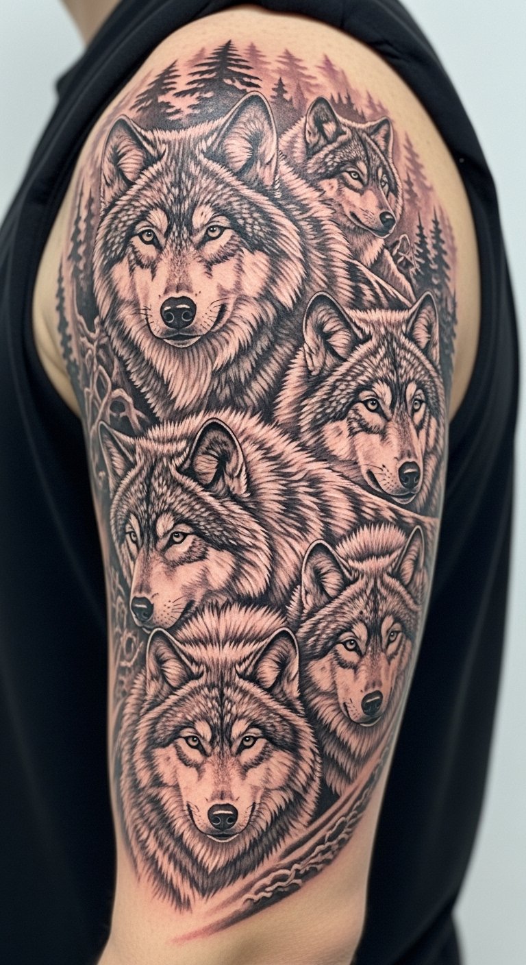 The wolf pack tattoo embodies the spirit of loyalty and family, reflecting deep emotional ties. Positioned on the upper arm, it serves as a constant reminder of the bonds that matter most.