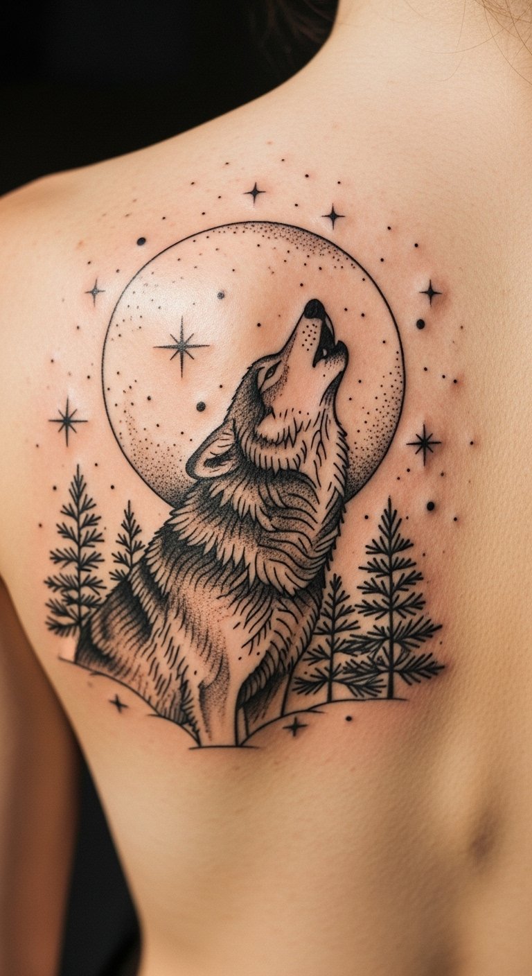 This tattoo embodies the spirit of freedom and connection to nature, with the wolf representing instinct and the moon symbolizing guidance and transformation.