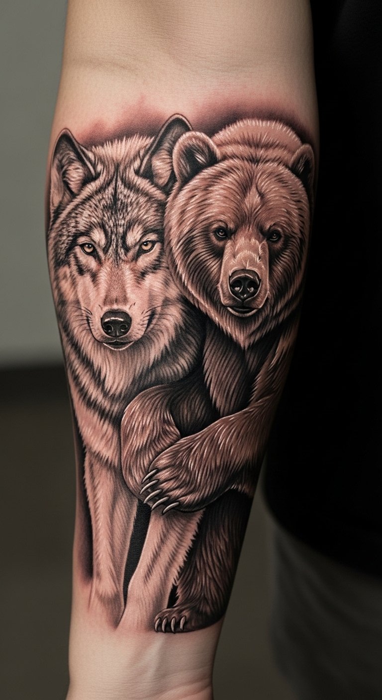 This tattoo symbolizes the profound strength found in unity, showcasing resilience and fierce loyalty between the wolf and bear.