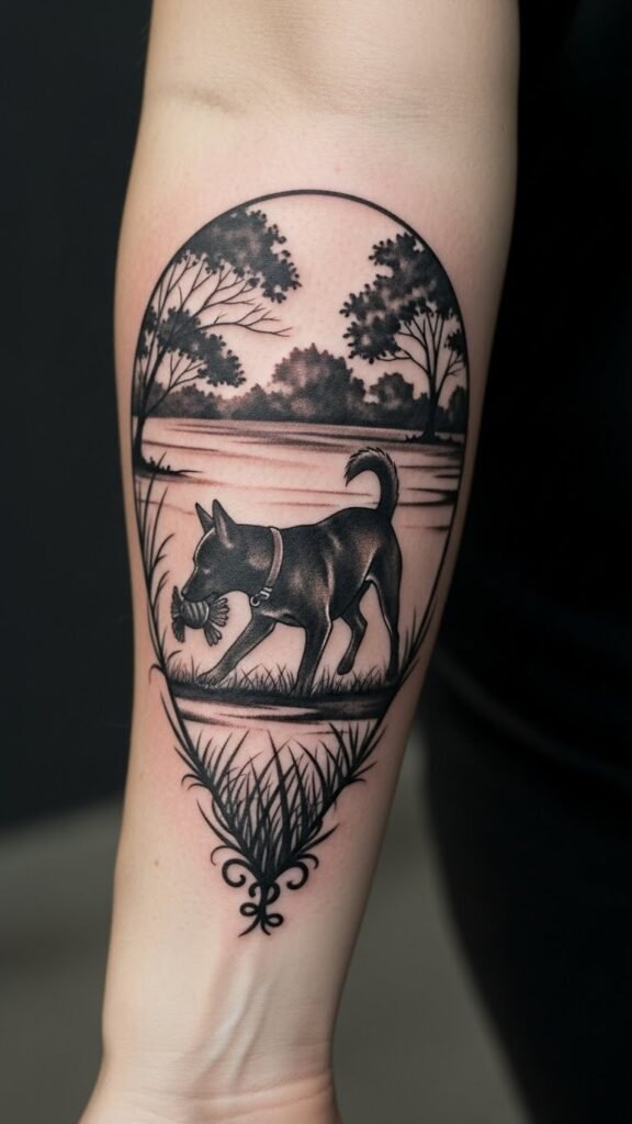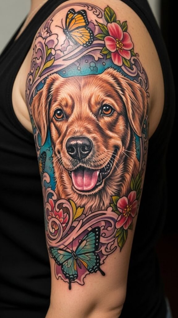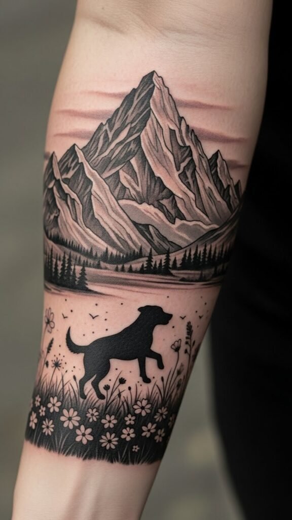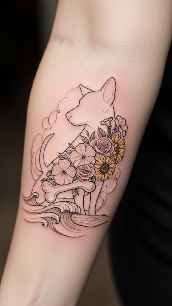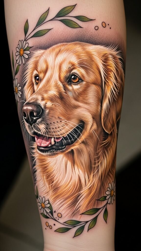 This tattoo beautifully symbolizes the bond shared with your dog, merging the essence of nature with cherished memories.