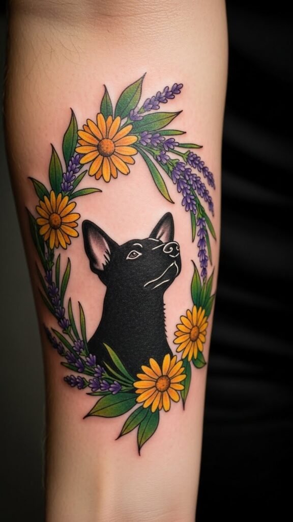 This tattoo design symbolizes the deep bond shared with a beloved pet, using flowers that represent joy and admiration. The yellow daisies evoke happiness, while the purple lavender signifies respect and love.