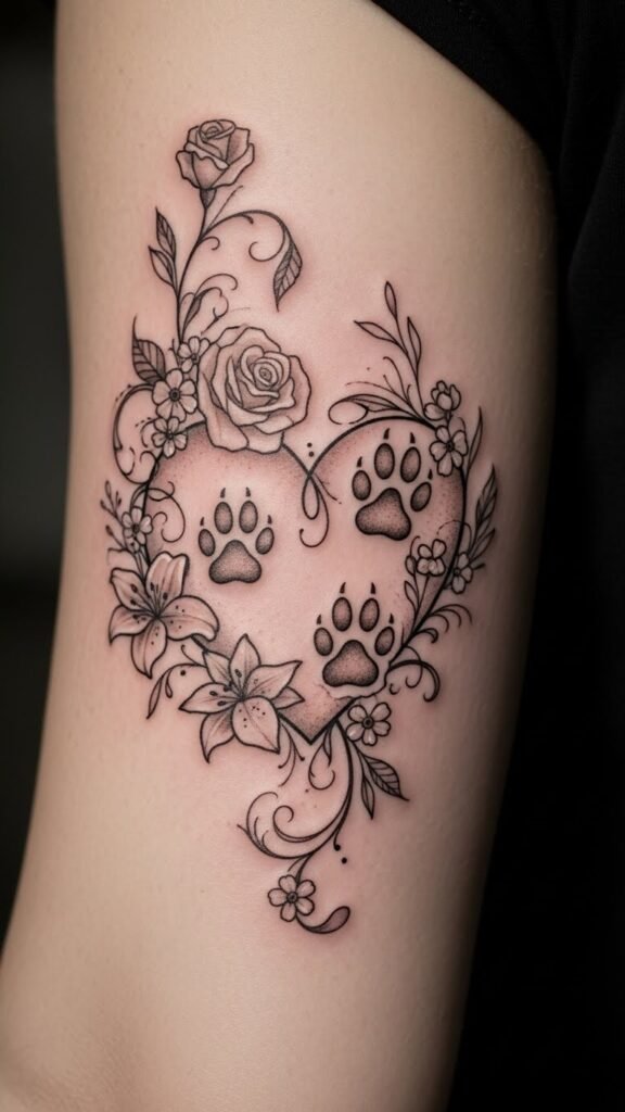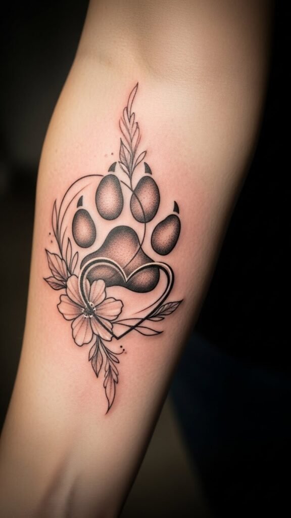 This tattoo symbolizes the unbreakable bond between you and your furry friend, with the paw print representing their presence and the heart reflecting the love that remains. Placed on the forearm, it serves as a constant reminder of the joy and companionship you shared, allowing you to carry their memory with you wherever you go. The floral elements add a touch of beauty, signifying the growth and love that flourished during your time together.