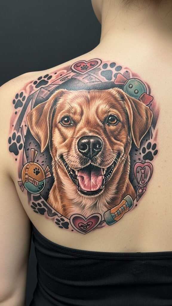 Placed on the upper back, the tattoo acts as both a personal reminder and a visible celebration of your furry companion, allowing you to carry their spirit with you wherever you go.