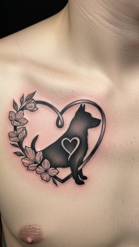 The floral accents enhance the emotional depth, representing the love and joy your dog brought into your life, while the heart signifies the enduring spirit of that relationship, reminding you that they’ll always hold a special place within you.