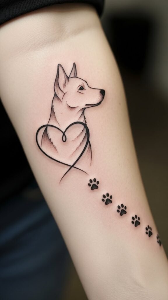 This tattoo serves as a heartfelt tribute to a beloved canine companion, symbolizing the bond and love shared. The paw print reflects the joy and memories created, while the heart signifies the deep emotional connection that persists.