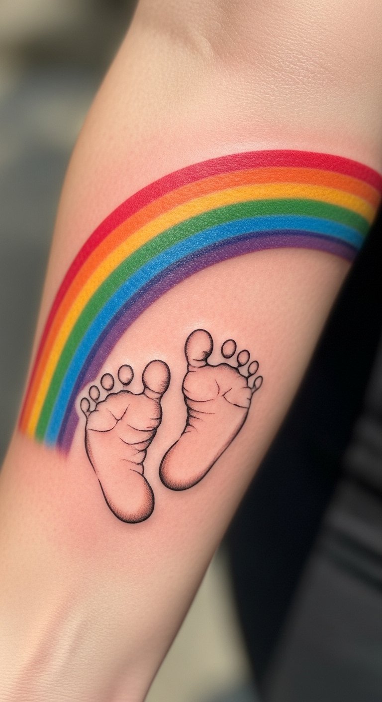 Placed on the forearm, it remains visible, allowing the wearer to carry this powerful reminder of their journey with them. The rainbow signifies positivity and healing, while the baby footprints serve as a tender tribute, honoring the memory of the child.