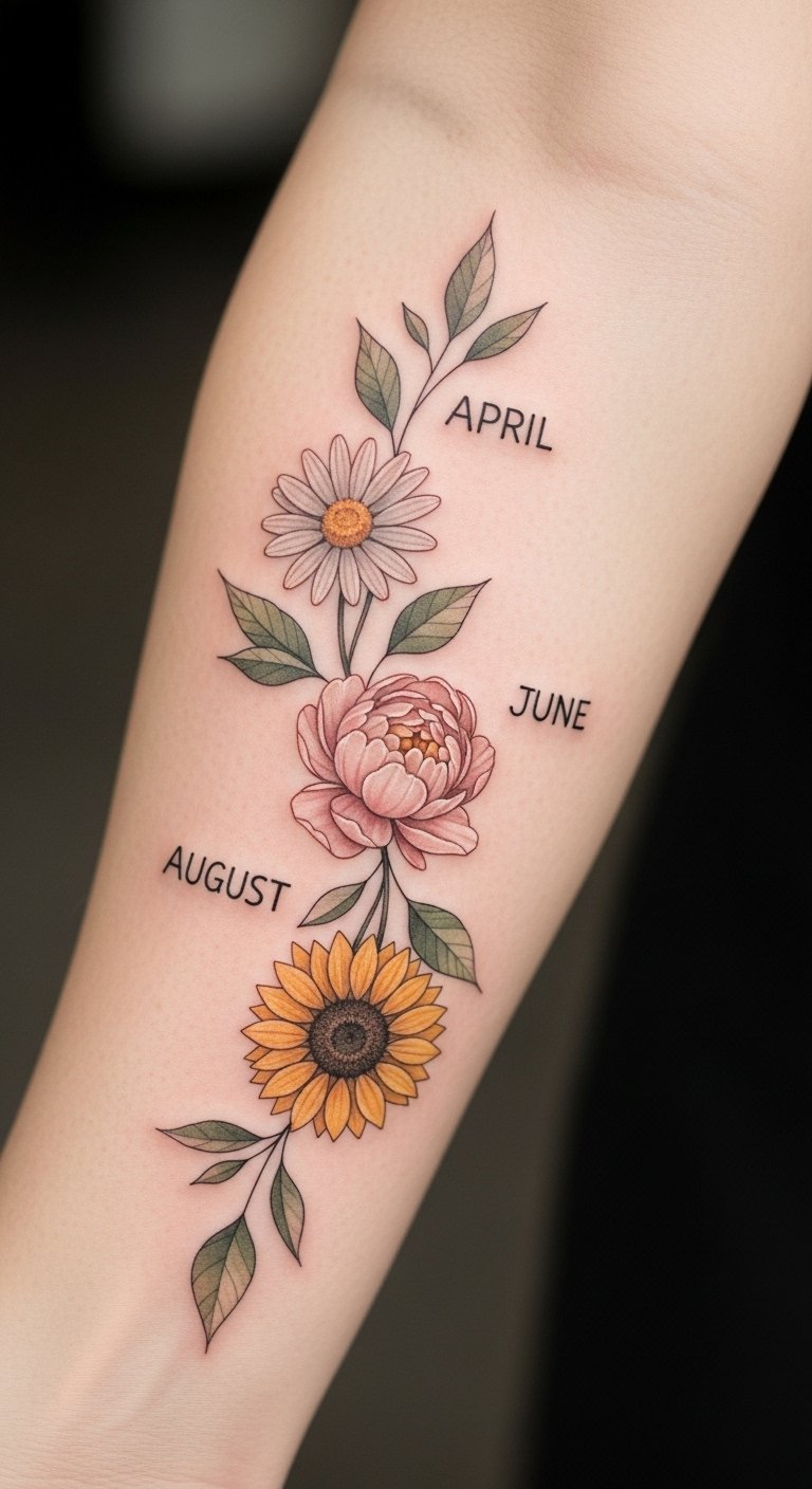 This tattoo symbolizes the enduring bond between a parent and their child, capturing the essence of love and loss through the beauty of birth month flowers.