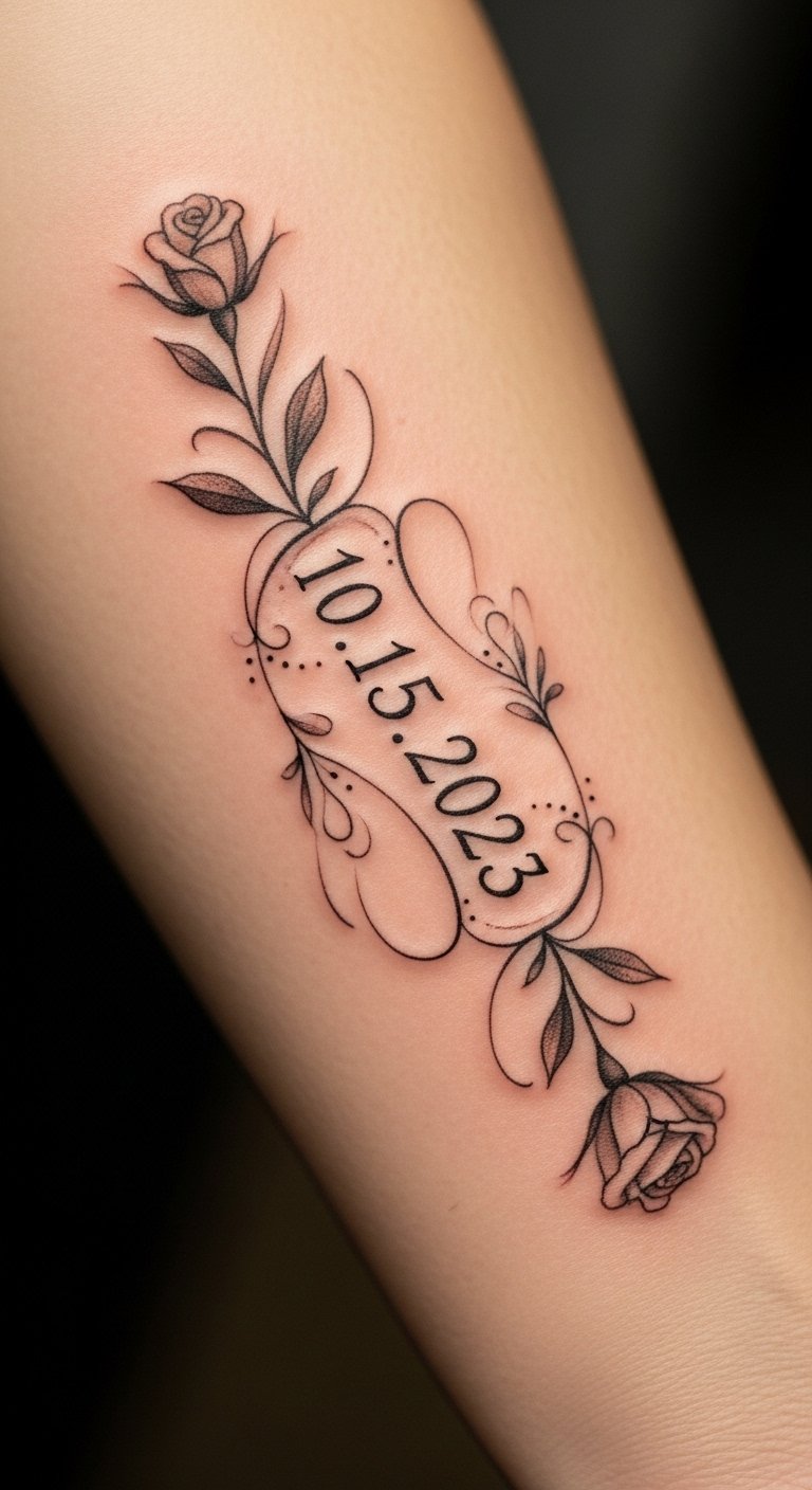 The inner forearm is a visible area, allowing for easy reflection and connection to the moment it commemorates. The floral accents signify the beauty of life and the enduring love that remains, making this design a heartfelt tribute to the bond shared.