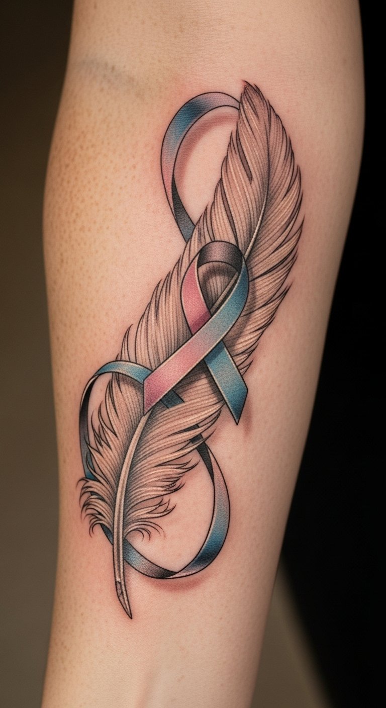 This tattoo design serves as a poignant tribute to the journey of loss and remembrance. The feather represents freedom and the soul’s journey, while the awareness ribbon symbolizes the shared experience of grief.
