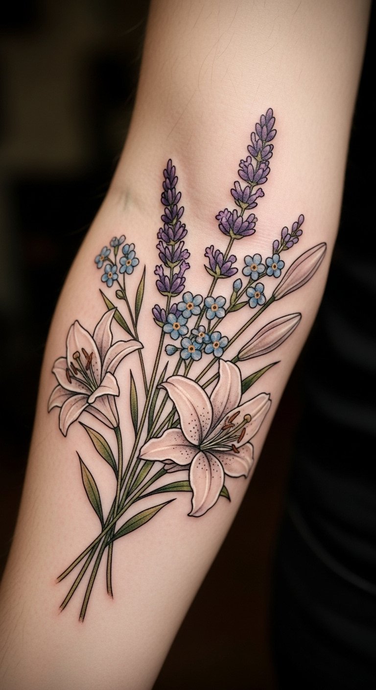 This tattoo symbolizes a heartfelt tribute to lost life, with each flower representing the unique essence of a child. The lavender signifies purity and devotion, while forget-me-nots embody remembrance and love.