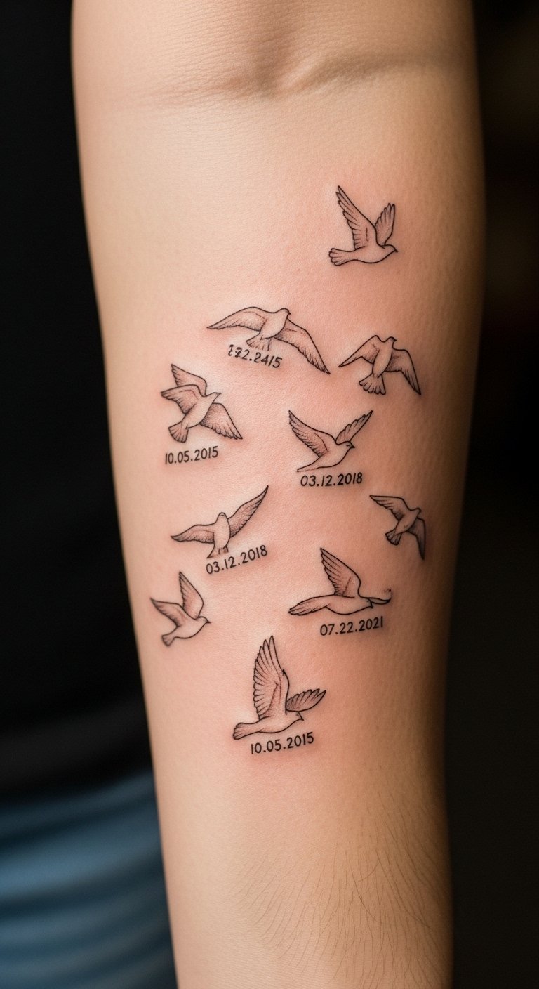 The birds in flight evoke a sense of hope and release, while the incorporated dates anchor the design in cherished memories.