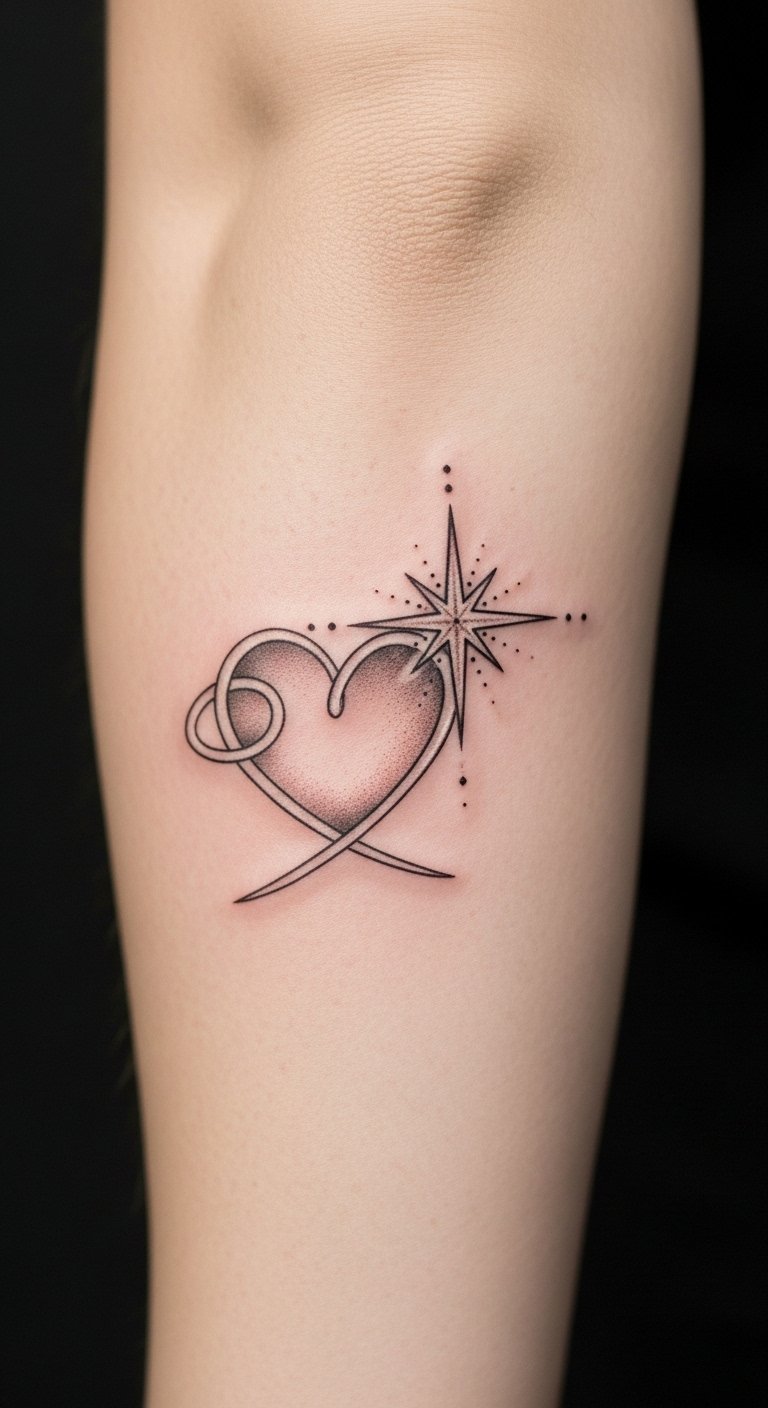 The heart and star combination tattoo serves as a poignant tribute to the bond shared with a child, positioned on the inner forearm for visibility and personal connection.