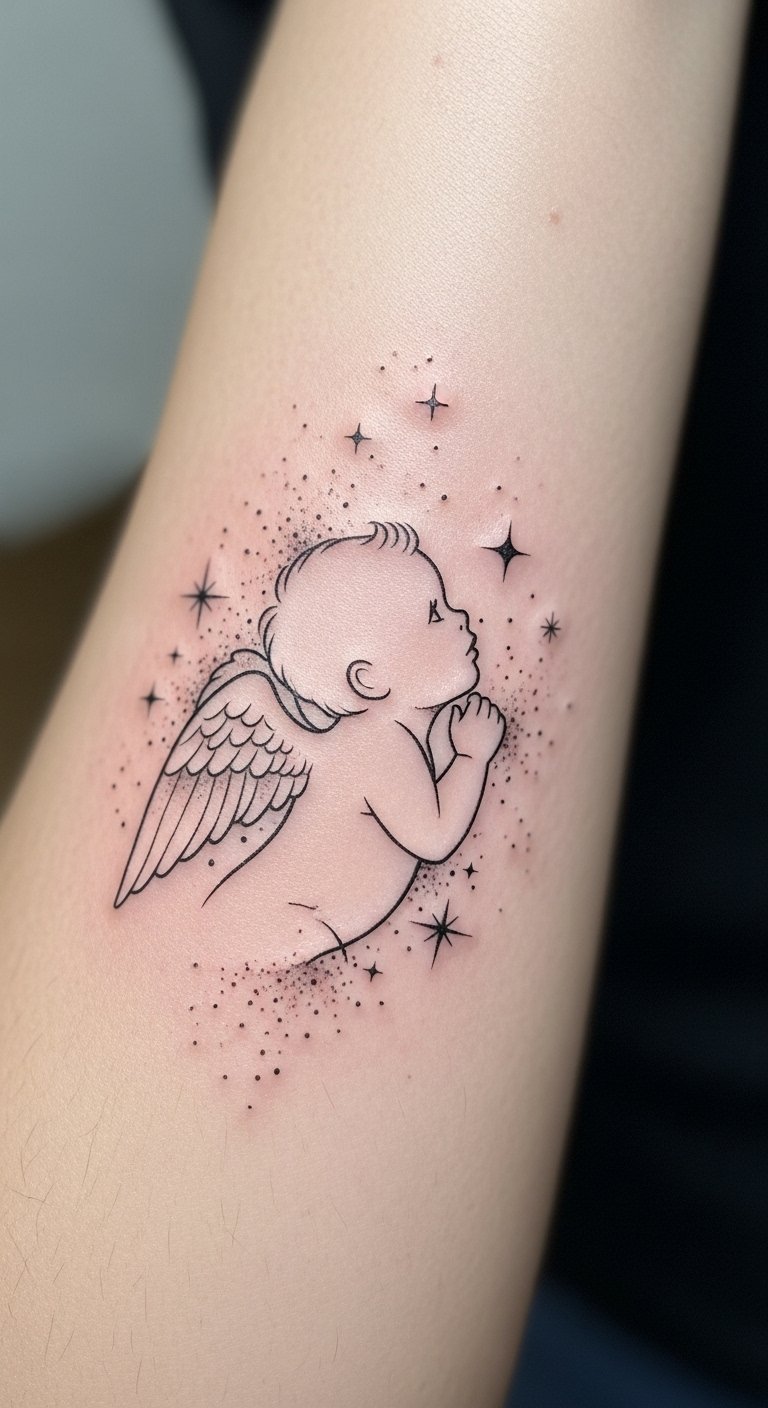 The angel baby silhouette tattoo serves as a heartfelt tribute to a cherished little one, embodying love and loss.