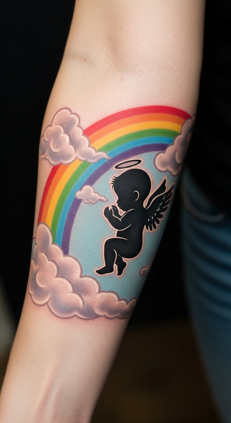 The angel baby silhouette honors a precious journey, while the rainbow and clouds embody the beauty and possibilities that can emerge even in sorrowful moments.