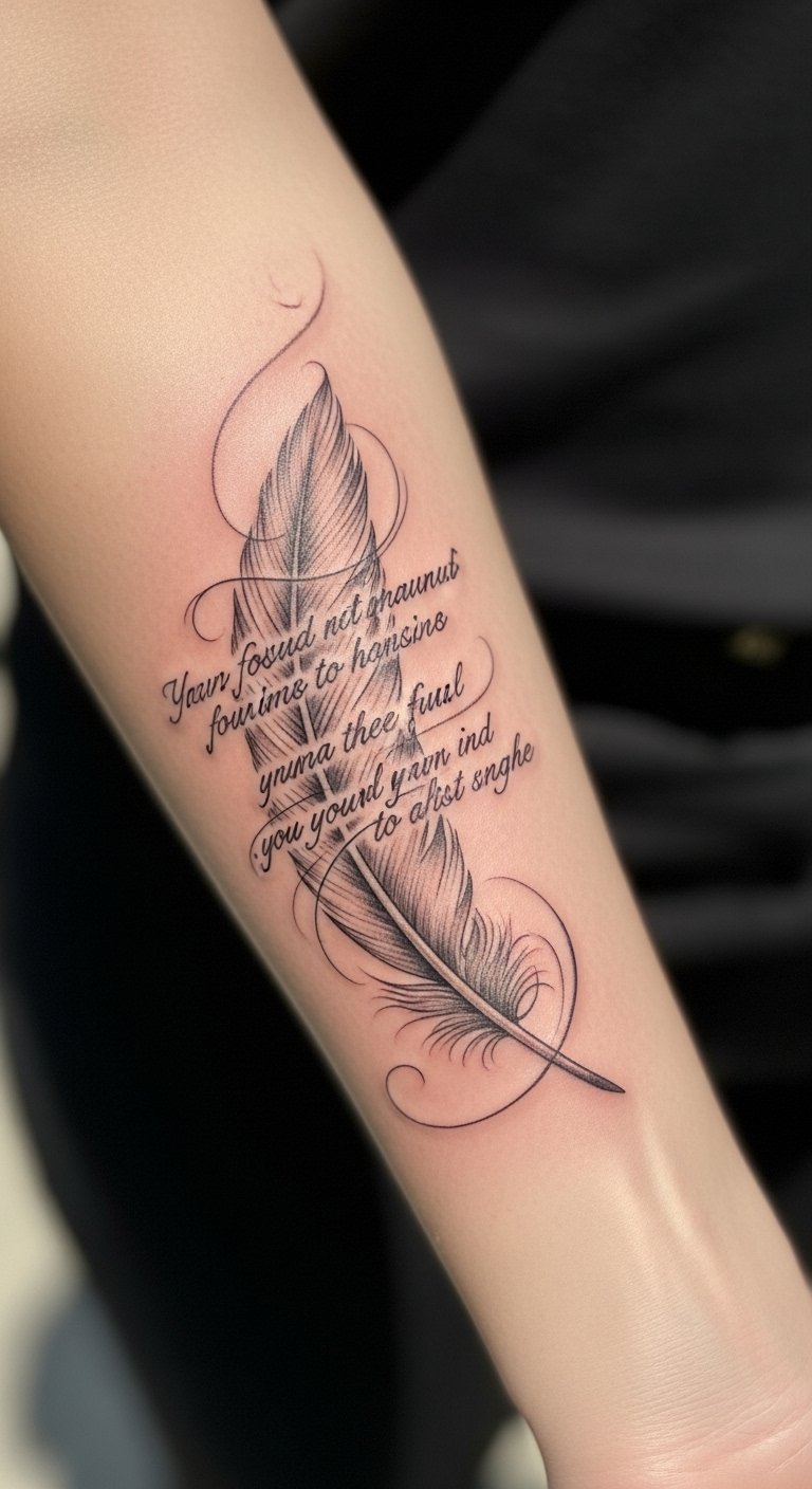 The chosen quote, flowing alongside the quill, encapsulates personal feelings of resilience and love, serving as a reminder of the strength found in remembrance.