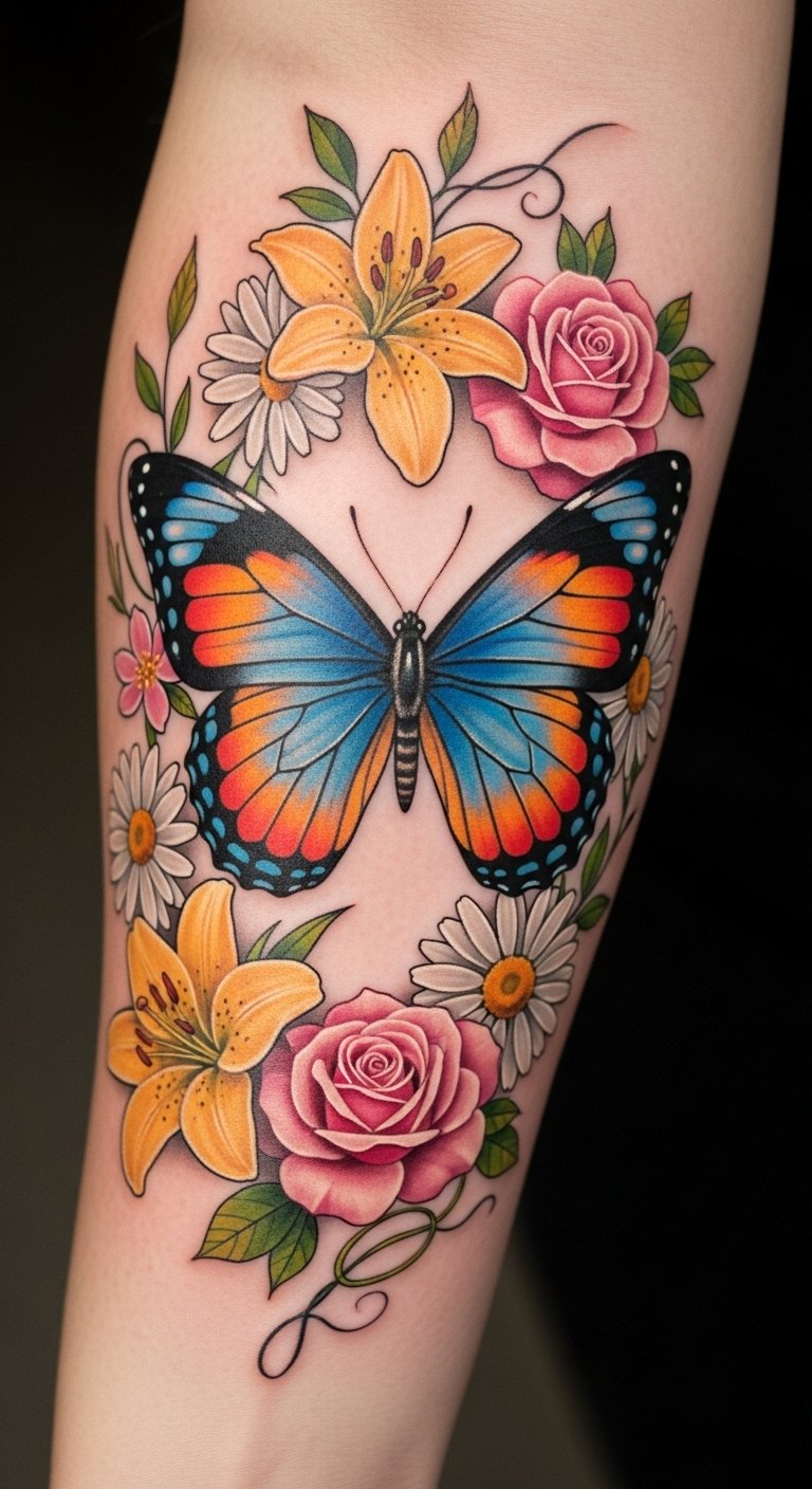 The butterfly represents spiritual rebirth, while the surrounding flowers reflect the emotional connection and grief experienced.