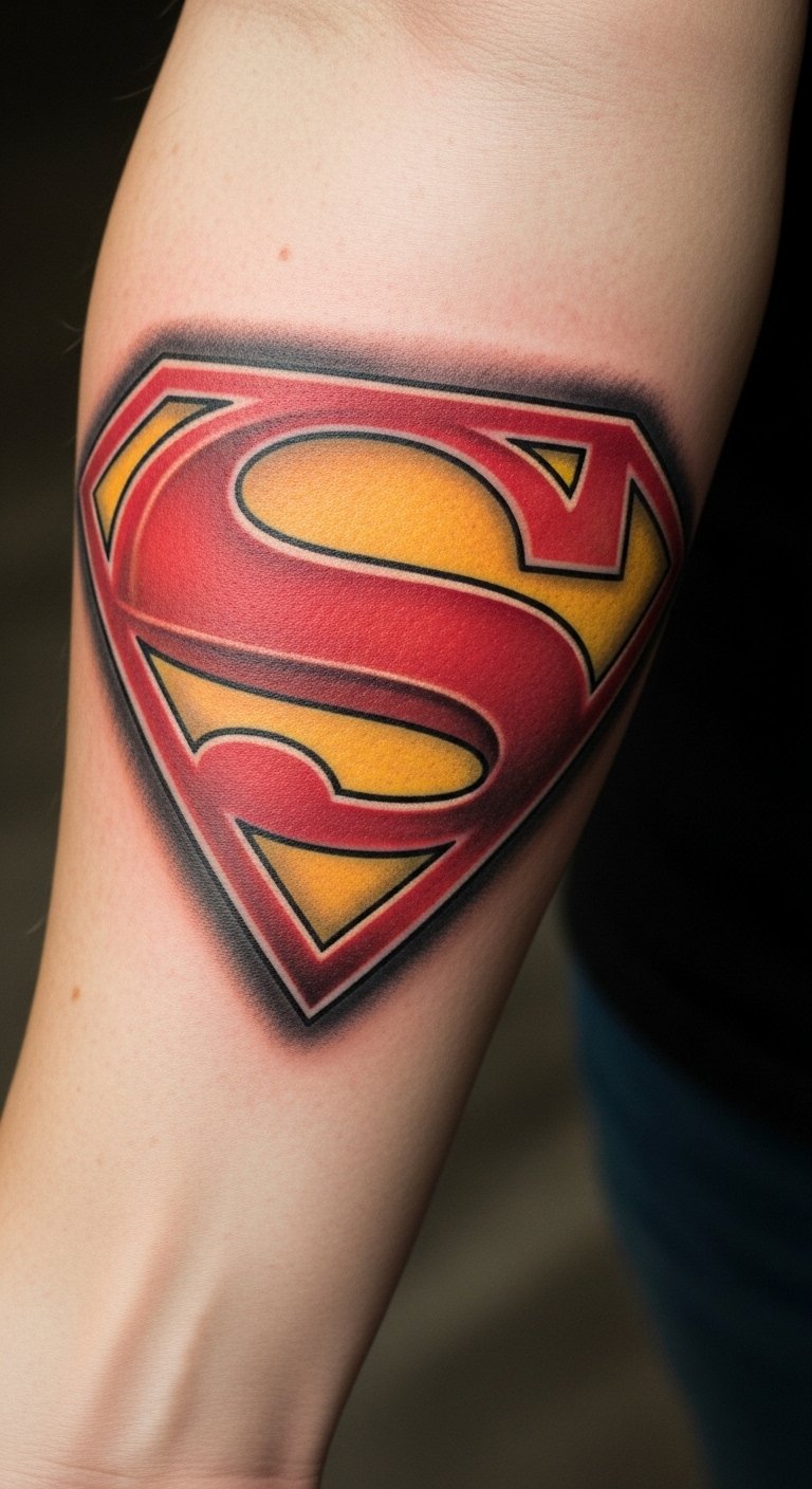 This tattoo serves as a personal emblem of resilience and courage, reflecting the wearer’s admiration for Superman’s values.