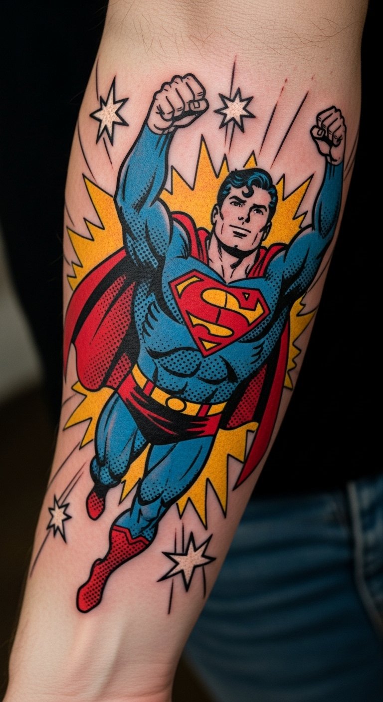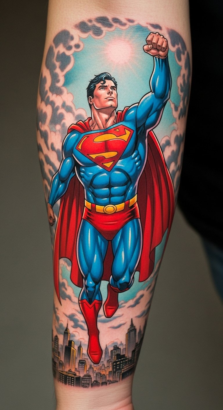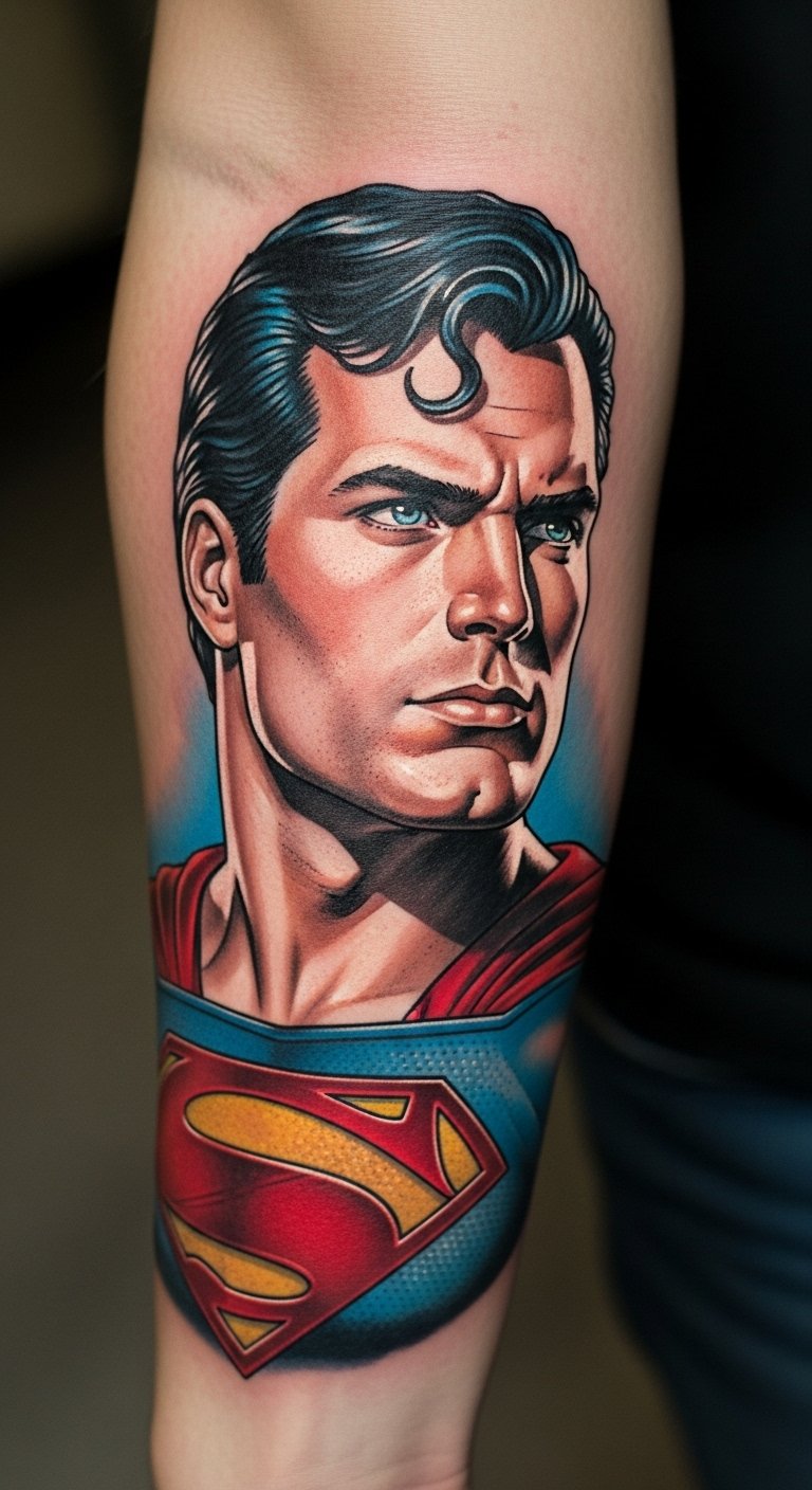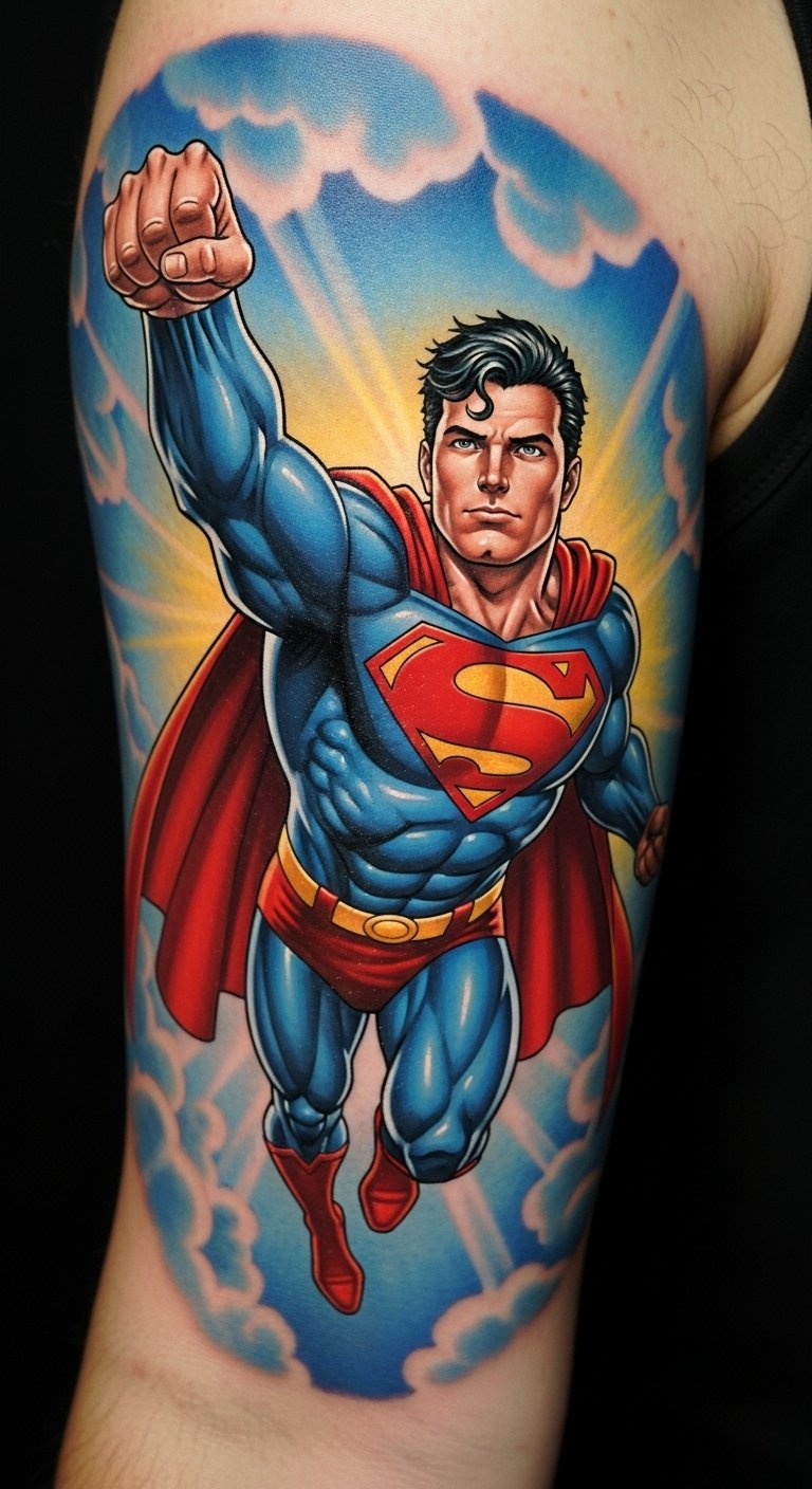 This tattoo symbolizes the enduring spirit of heroism and the nostalgia of classic comics.