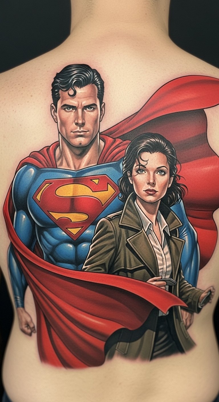 This tattoo symbolizes the powerful bond between Superman and Lois Lane, representing their love, partnership, and shared heroism.