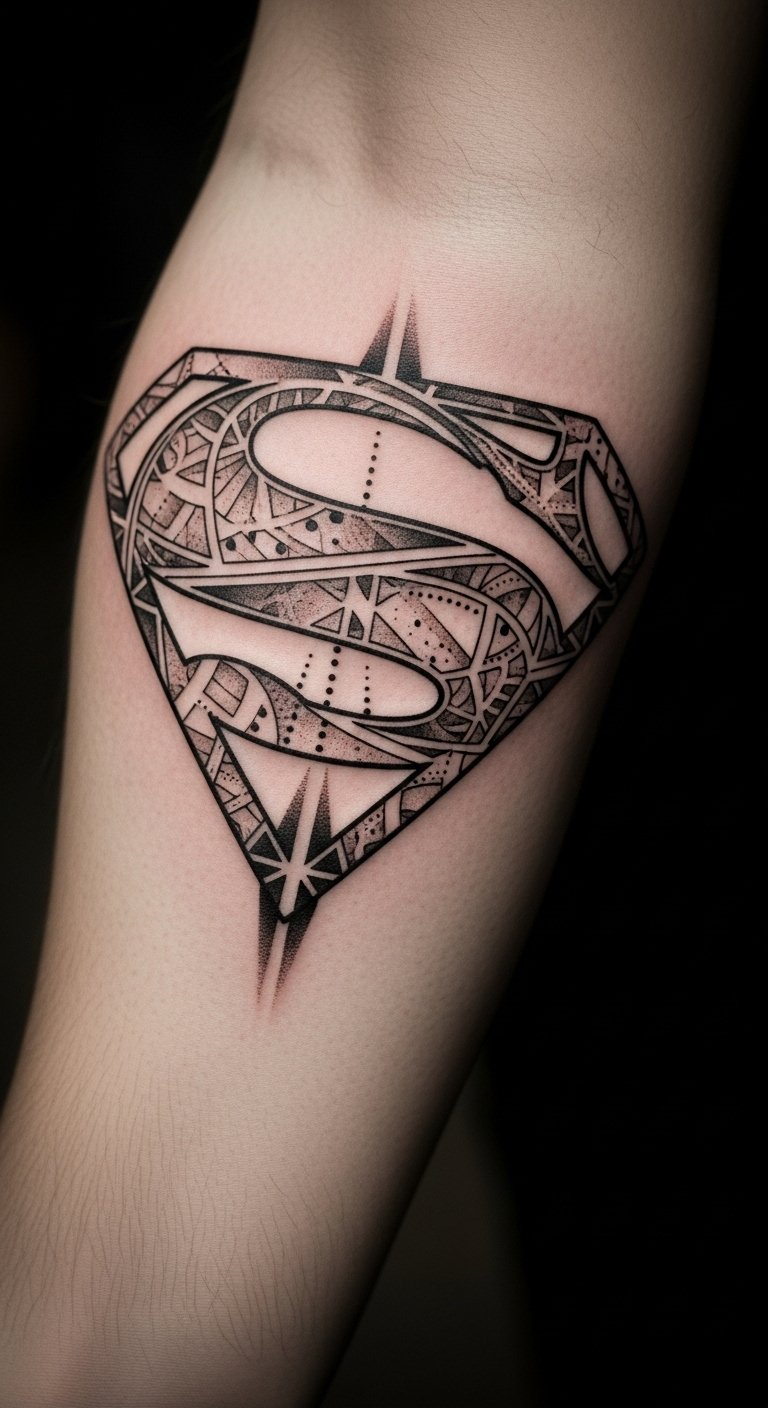 This abstract Superman tattoo represents not only the classic emblem of heroism but also the personal journey of strength and resilience.