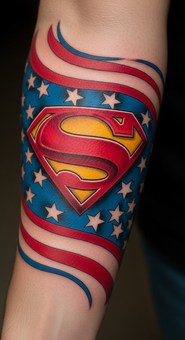 The tattoo on the forearm serves as a bold testament to the wearer’s passion for both their country and the heroic ideals embodied by Superman.