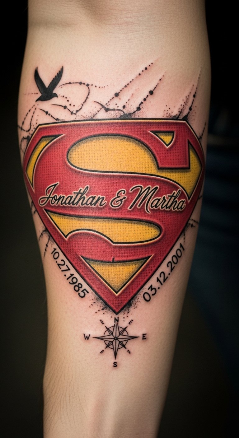 This tattoo represents the powerful connection to the Superman legacy, serving as a reminder of resilience and inner strength.