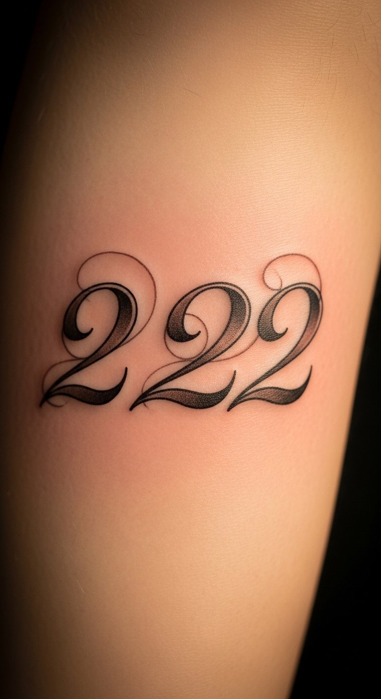 The number 222, with its elegant curves, symbolizes the dance of energies and emotions, reflecting a journey towards inner peace. Each time you glance at this tattoo, it encourages you to breathe and align your spirit, embodying the essence of new beginnings and the freedom they bring.