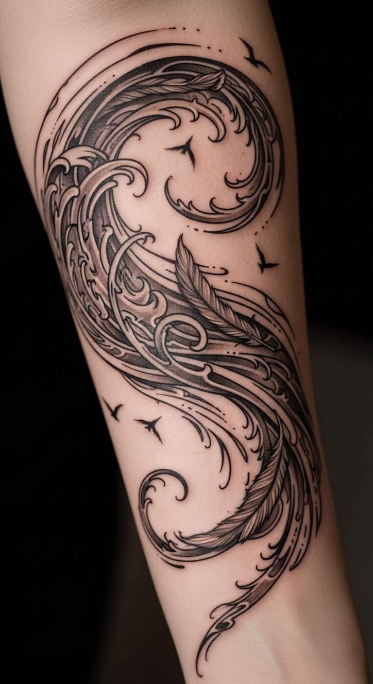 The flowing lines and images of birds signify freedom, while the feathers represent vulnerability and growth, capturing the essence of your journey towards embracing new beginnings.