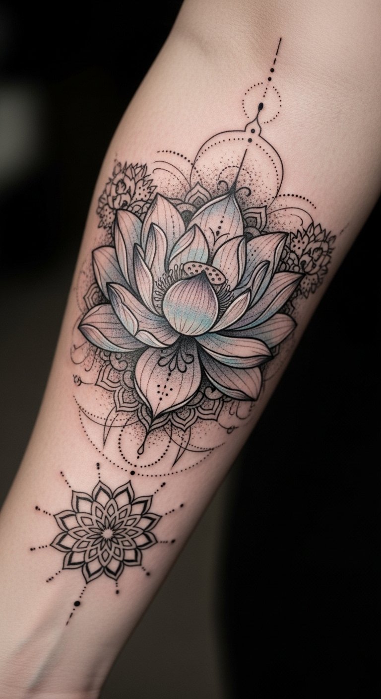 This tattoo design symbolizes spiritual awakening and personal growth, with the lotus representing purity and enlightenment rising from murky waters.