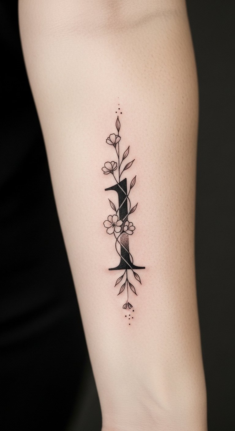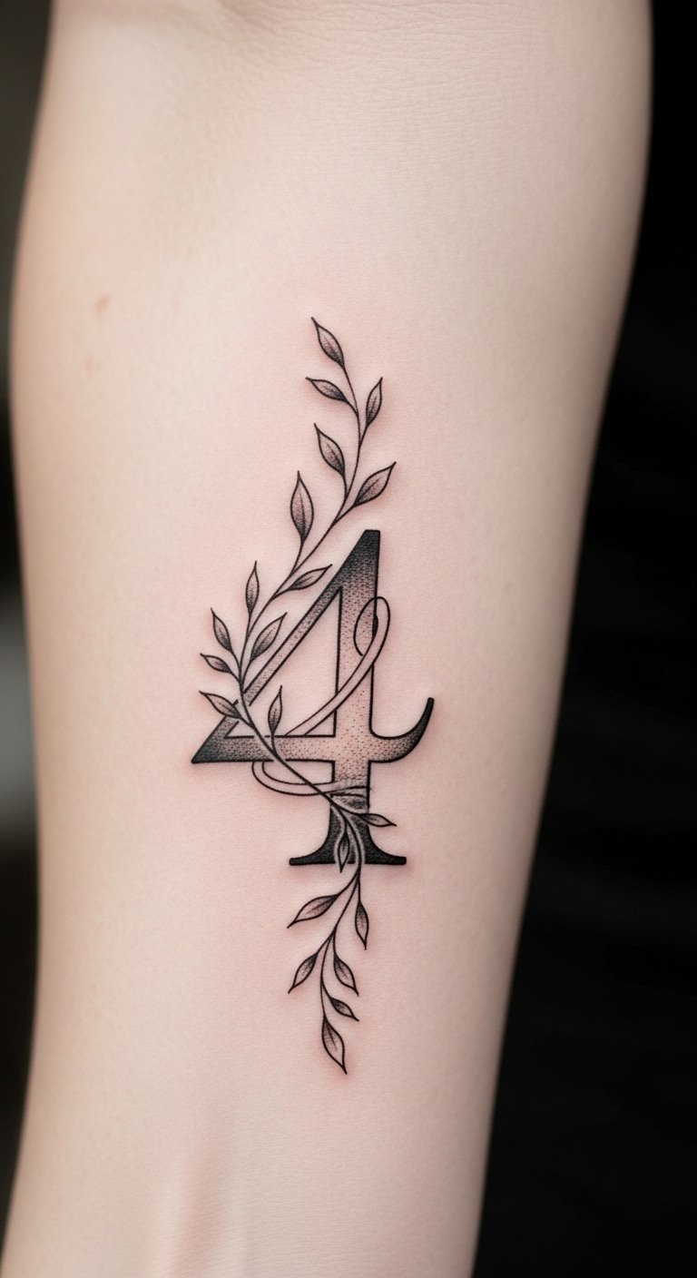This tattoo symbolizes the encouragement of self-discipline and stability in one’s life. The number 4, representing a foundation and order, is elegantly wrapped in a vine, signifying personal growth and resilience.