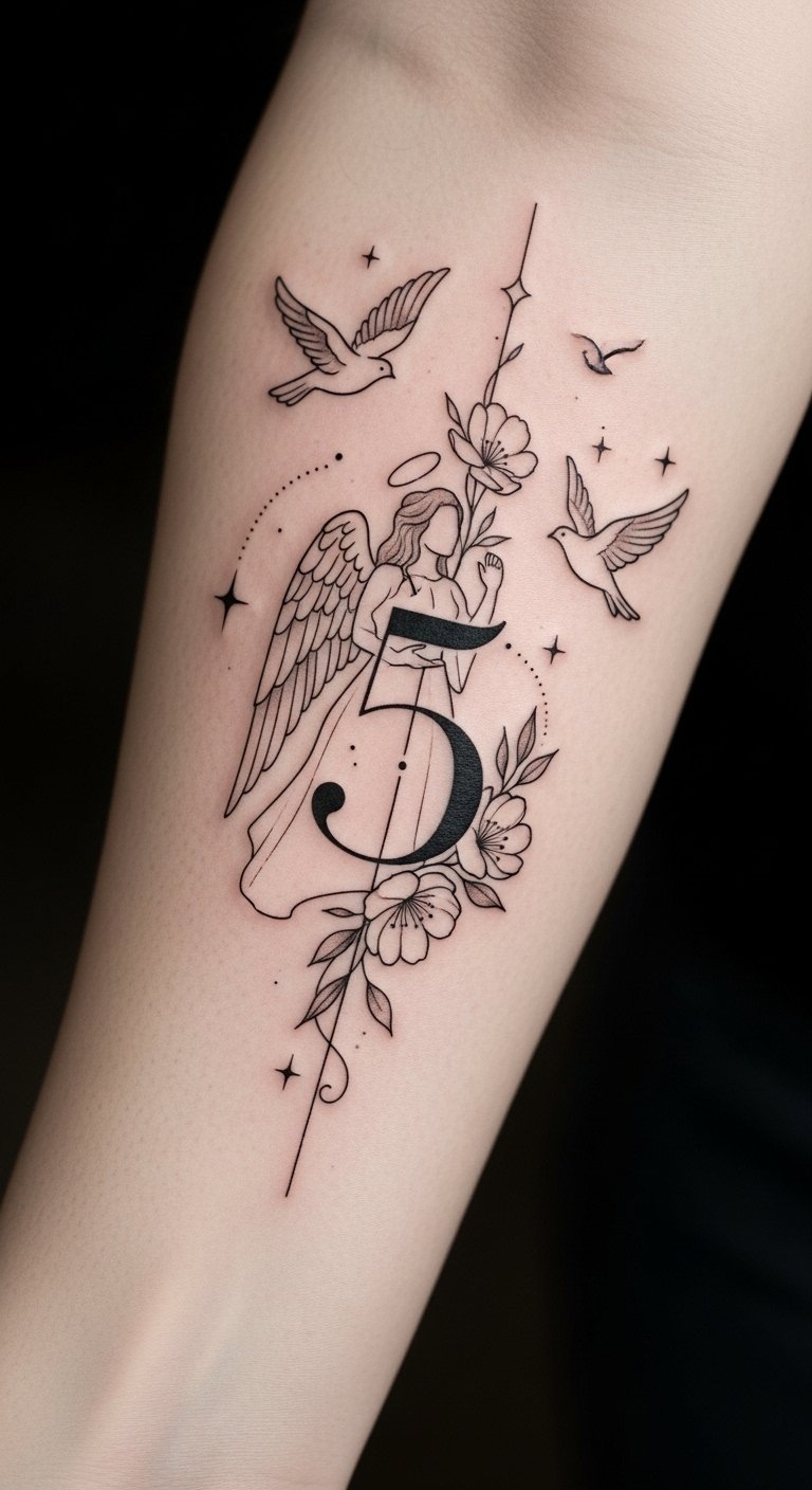This tattoo serves as a powerful reminder to embrace positive change and transformation in one’s life. The angel number 5 is a symbol of freedom, encouraging the wearer to pursue new adventures with courage.