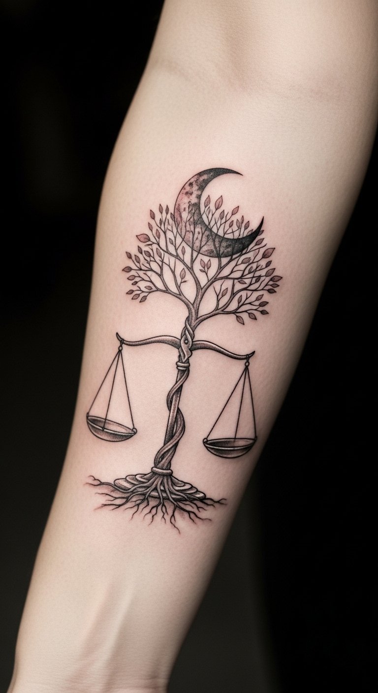 This tattoo concept embodies the journey of balancing material and spiritual life. The scale signifies the importance of material wealth, while the tree illustrates the spiritual aspect of one’s existence.