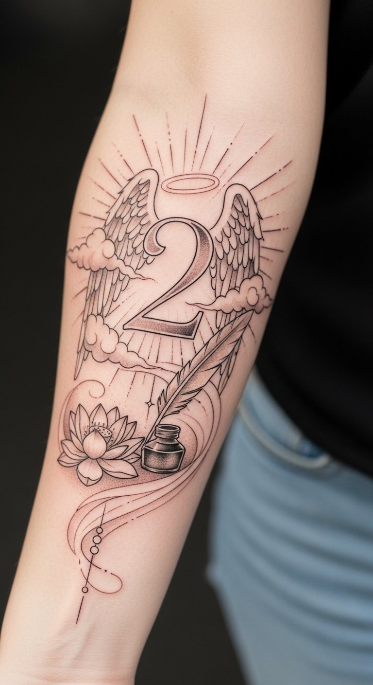 This tattoo concept embodies the transformative essence of the angel number 2, emphasizing spiritual awareness and connection.