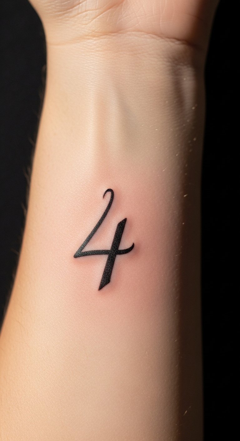 The tattoo of the number 4 on the inner forearm symbolizes grounding and stability, reflecting a personal commitment to inner strength and balance.
