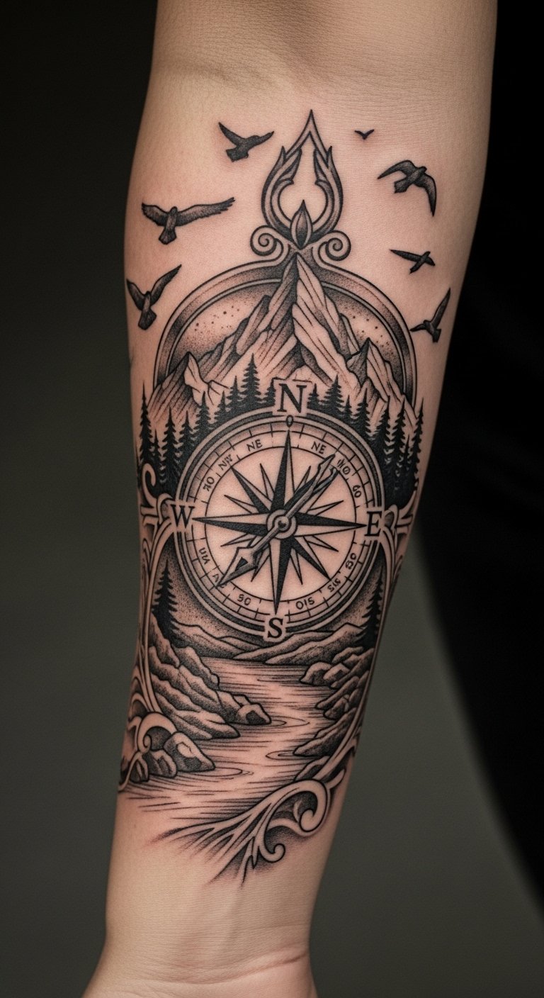 This tattoo design symbolizes the journey of exploration and personal growth, with the compass representing guidance and direction in life.