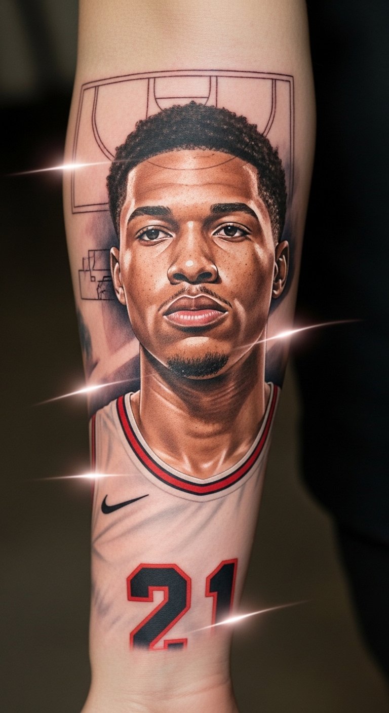 This tattoo embodies a deep connection to basketball’s heritage, symbolizing both passion for the game and respect for its pioneers.