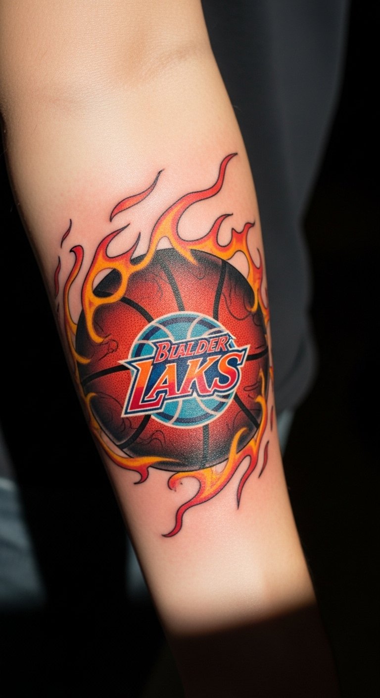 This tattoo symbolizes a deep passion for basketball, reflecting the dedication and energy associated with the sport.