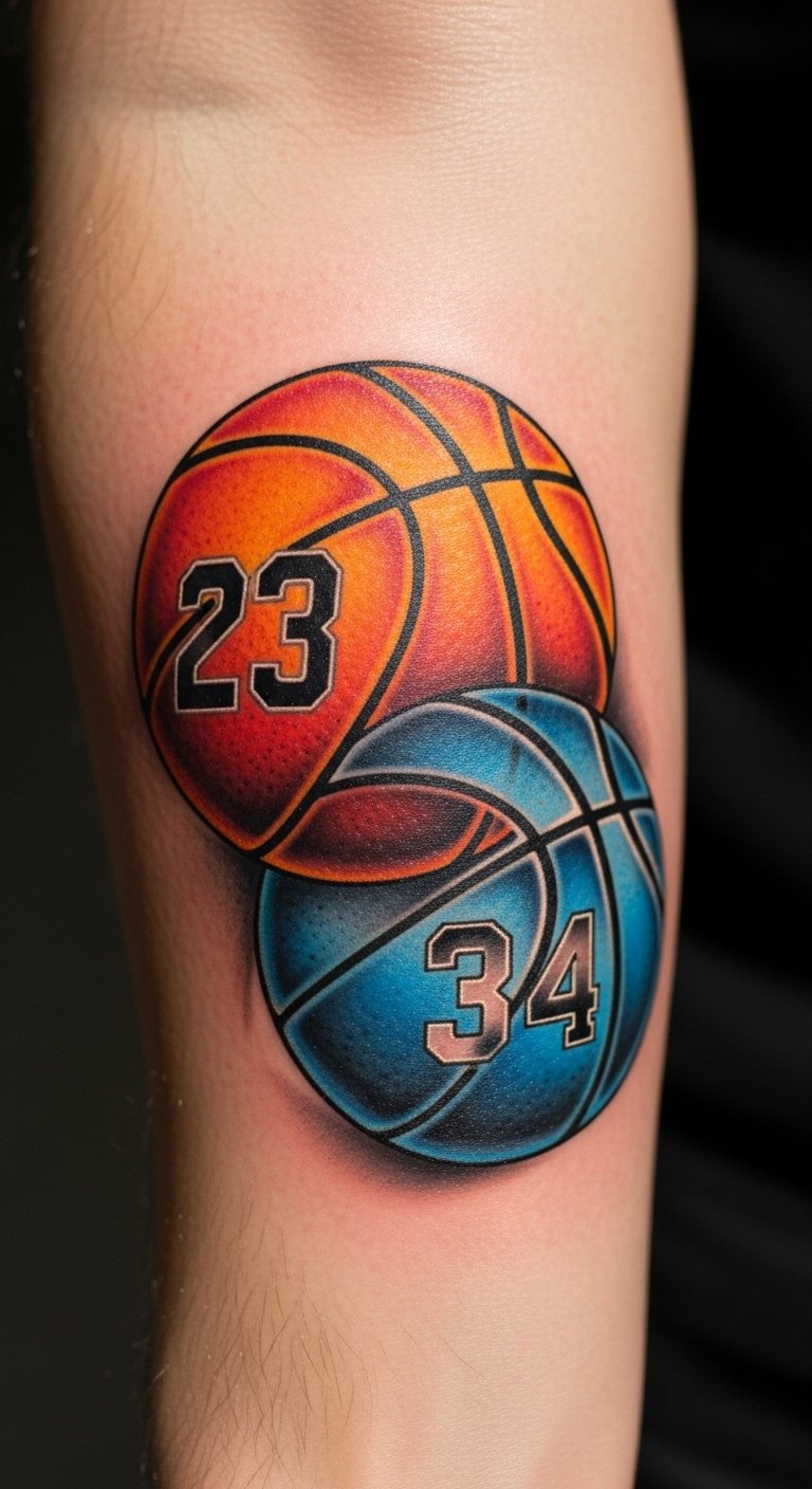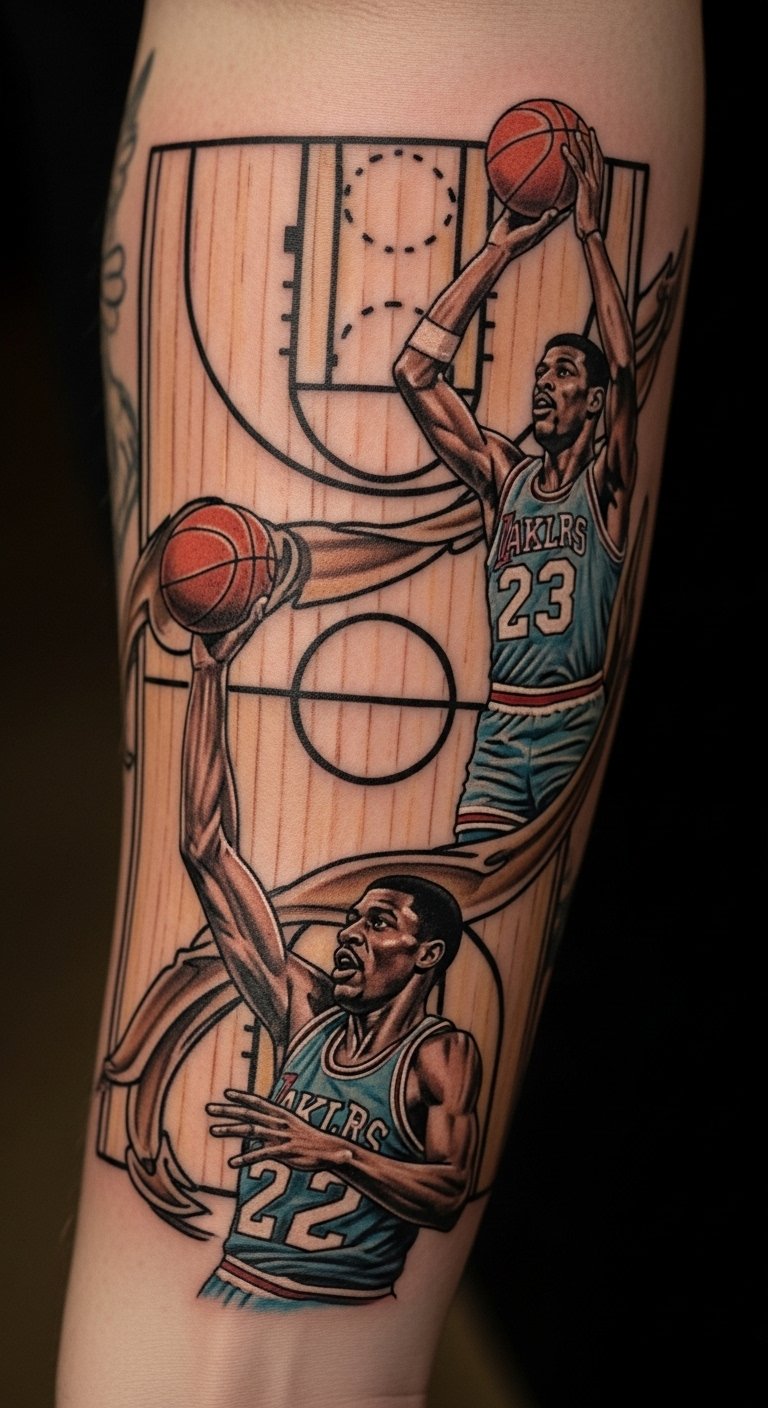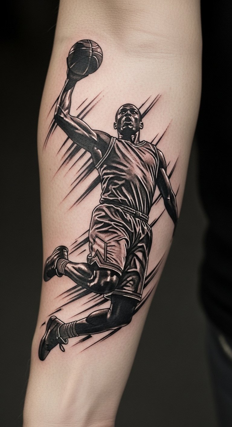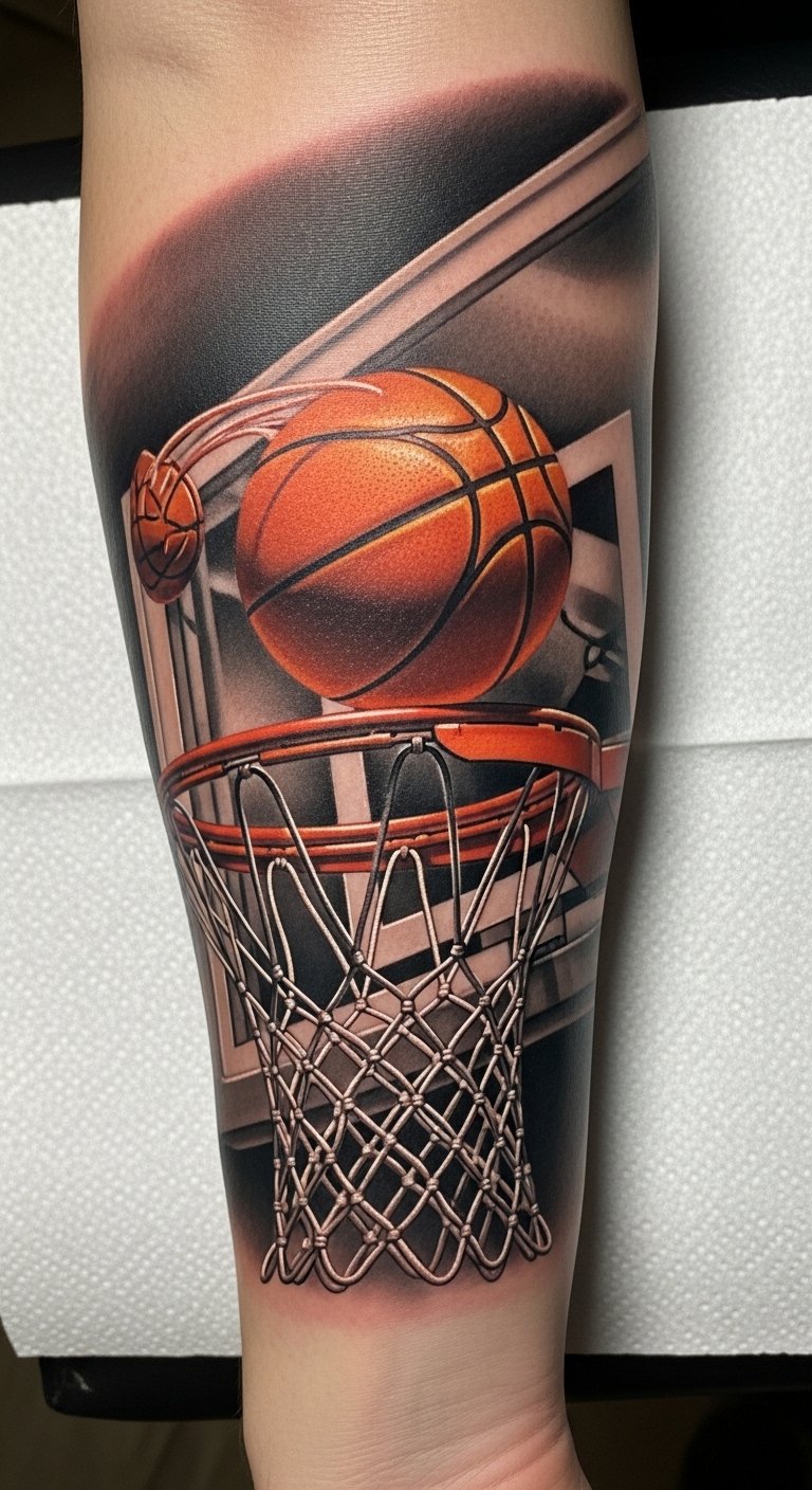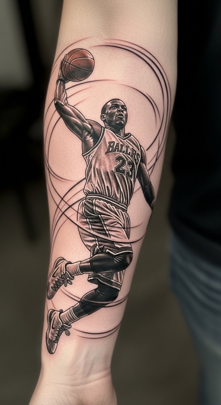This tattoo symbolizes the passion and artistry of basketball, capturing the exuberance of the game.