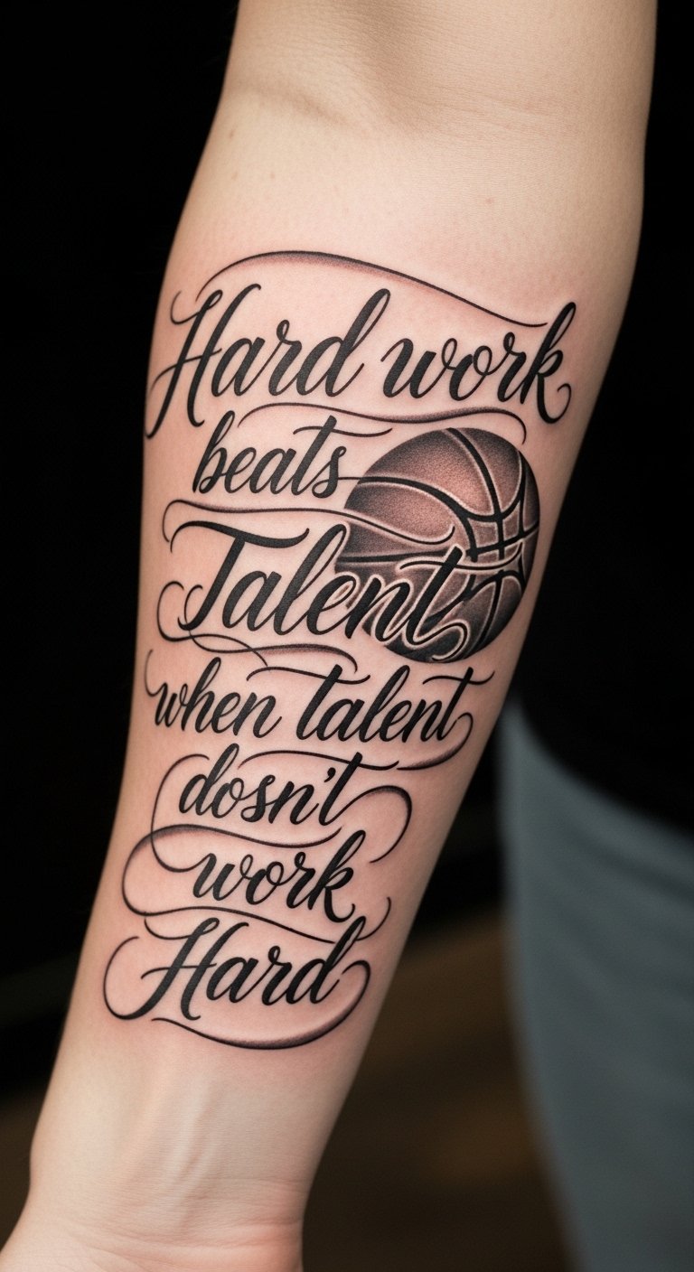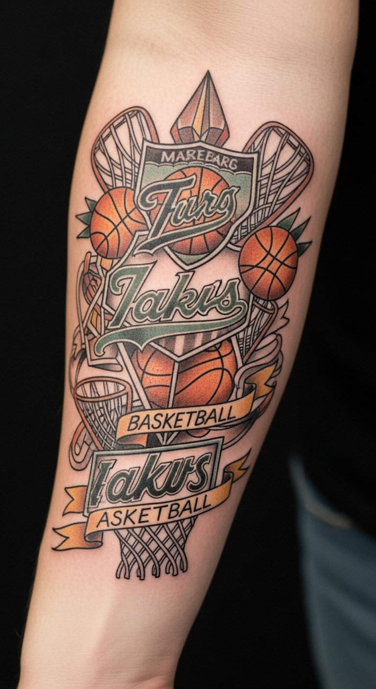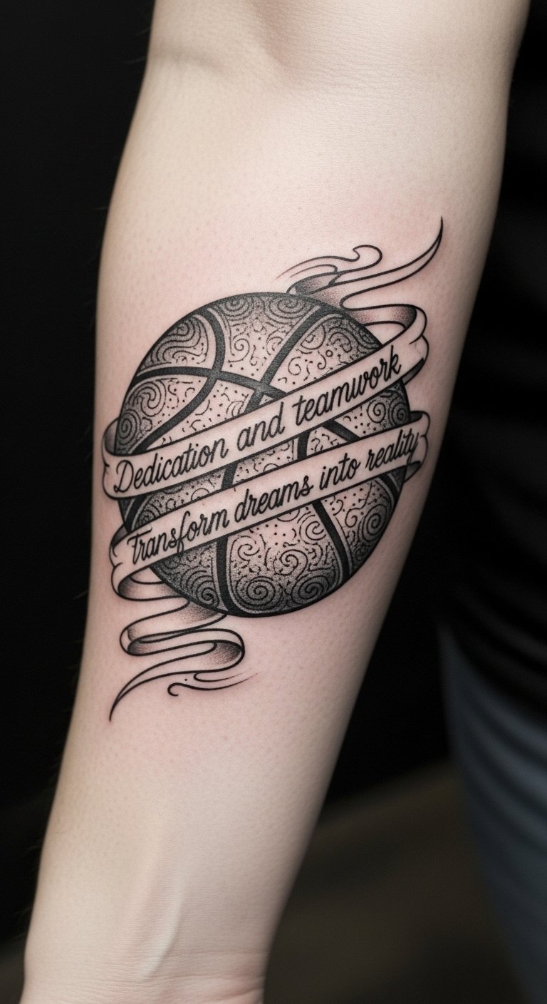 This tattoo design embodies the spirit of basketball, emphasizing the unity and commitment of players and fans alike. Positioned on the forearm, it serves as a constant reminder of the dedication required in the sport.