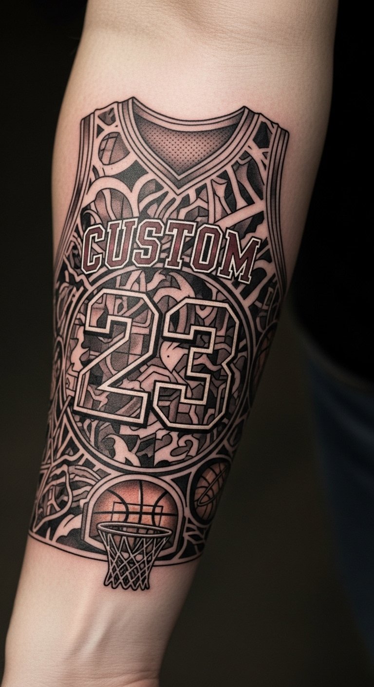 The jersey design adds a dynamic flair, enhancing the emotional resonance of the ink while celebrating the love for basketball.