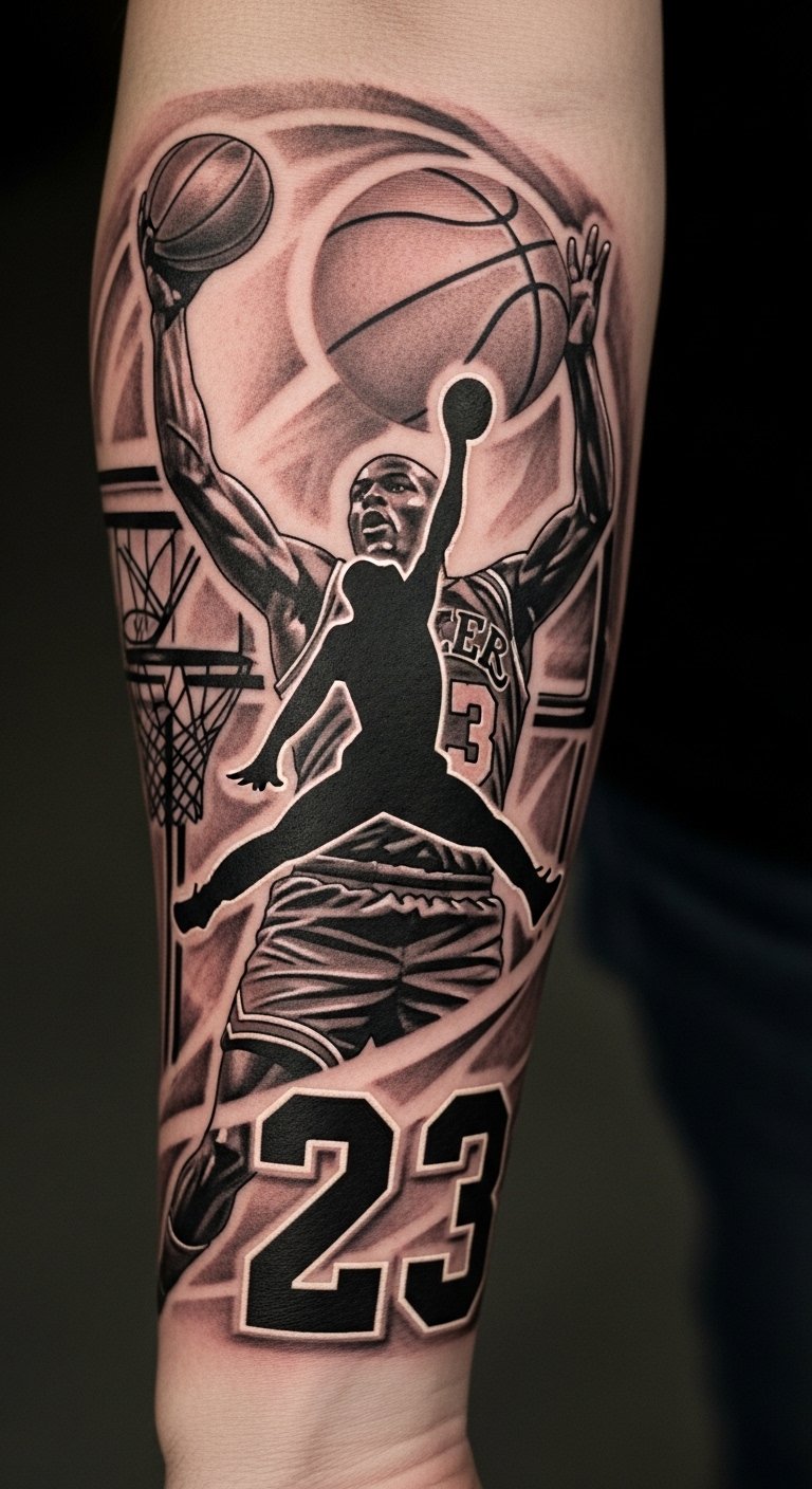 The forearm placement allows for visibility, making it a daily reminder of inspiration and passion for basketball. The incorporation of the jersey number and court elements creates a personal connection, while the silhouette pays homage to the player’s unique style and legacy, making it a powerful tribute that resonates emotionally with both the wearer and those who see it.