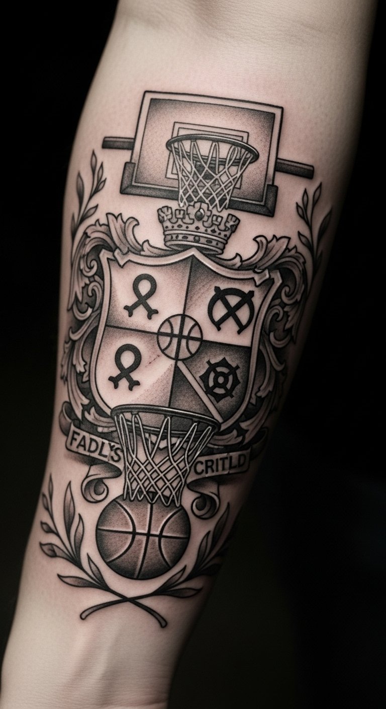 The combination of the family crest and basketball elements encapsulates the spirit of teamwork and generational pride, making it a powerful emblem of love and commitment to both family and sport.