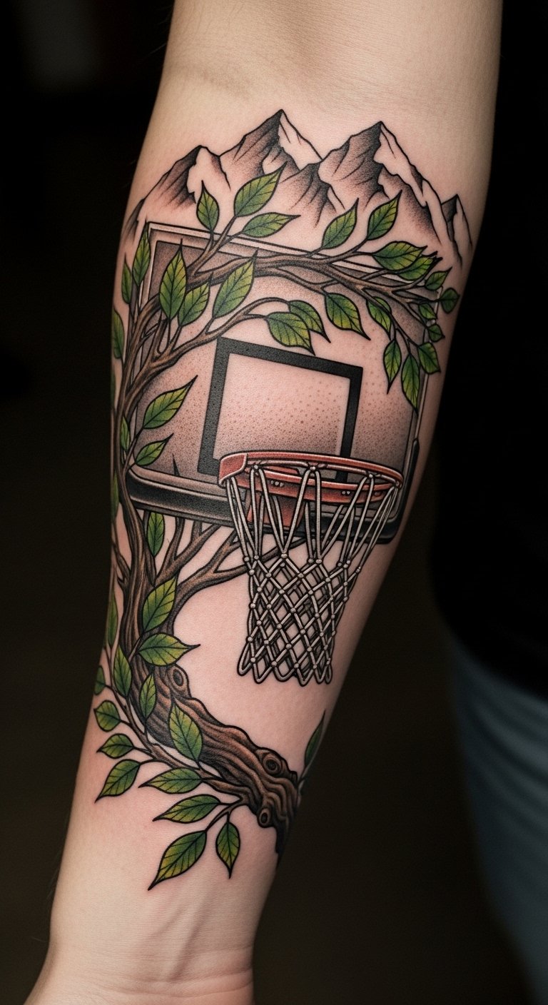 This tattoo symbolizes the harmonious relationship between basketball and nature, reflecting the passion for the sport and the beauty of the outdoors.
