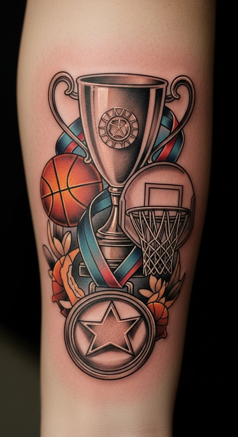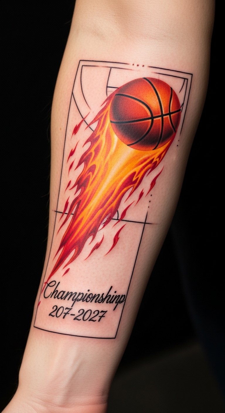 This tattoo not only commemorates a triumphant moment in your basketball journey but also embodies the passion and intensity of the game.