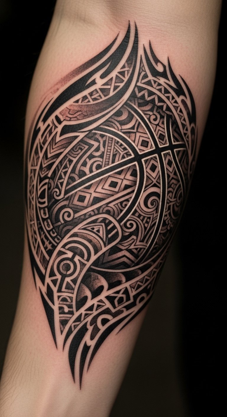 This tattoo design serves as a tribute to both the sport of basketball and the wearer’s cultural heritage. The basketball symbolizes personal achievements and dedication, while the intertwined cultural symbols honor the individual’s roots.
