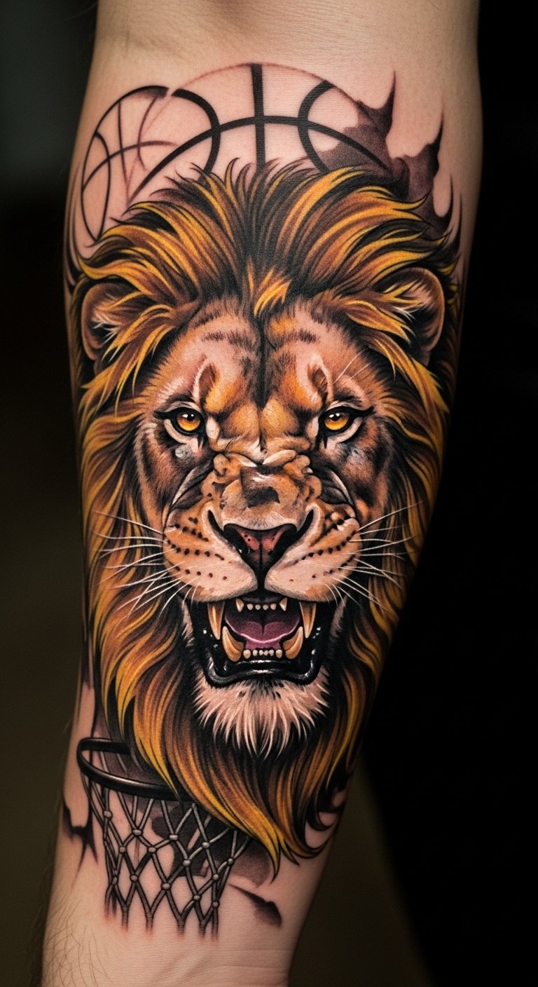 This tattoo symbolizes strength, courage, and the relentless spirit of teamwork, embodying the fierce determination of a basketball mascot.
