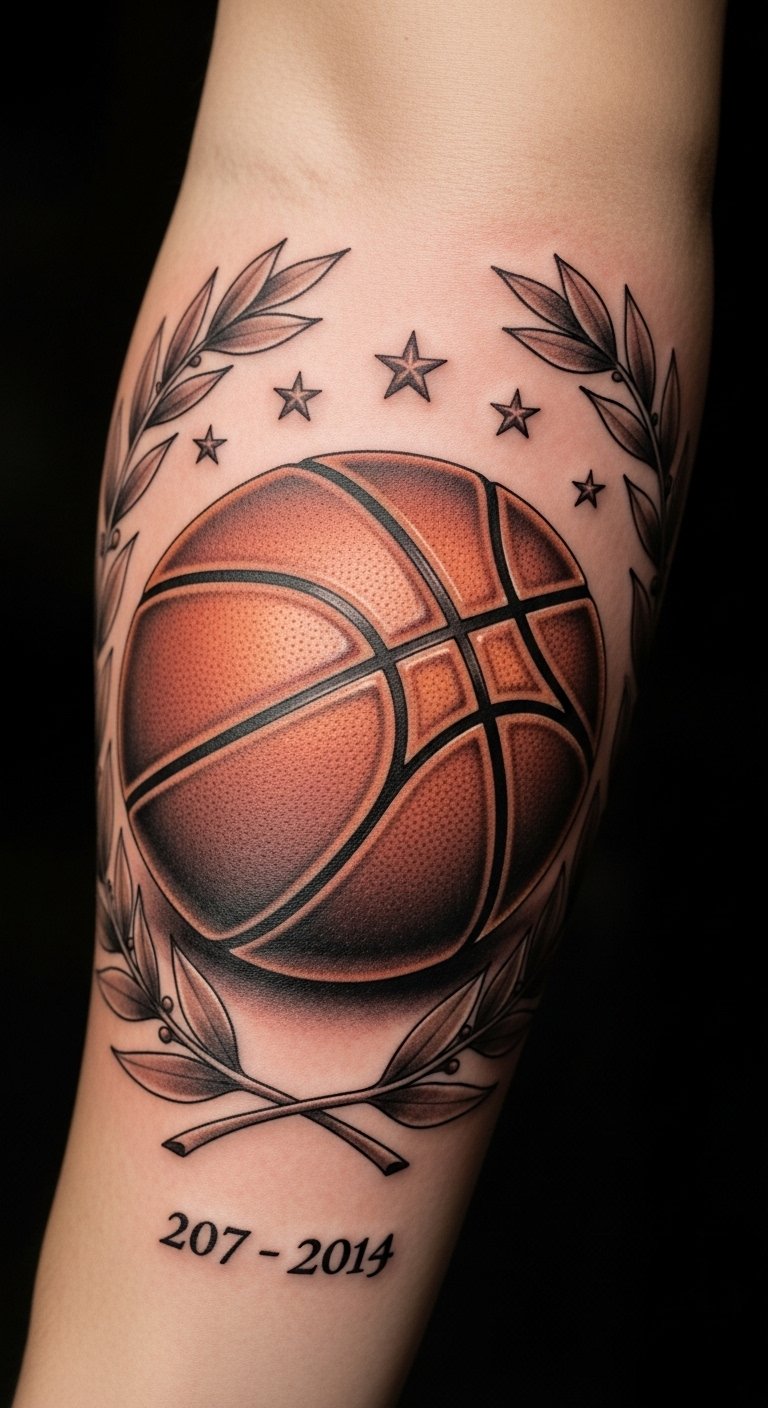 This tattoo serves as a powerful tribute to the wearer’s basketball journey, symbolizing dedication and triumph. The basketball embodies passion for the game, while the laurel wreath signifies victory and honor.