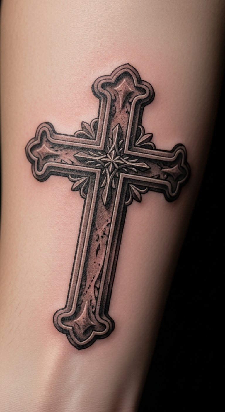 The cross on the forearm serves as a constant reminder of faith and sacrifice, visible to both the wearer and those around them.