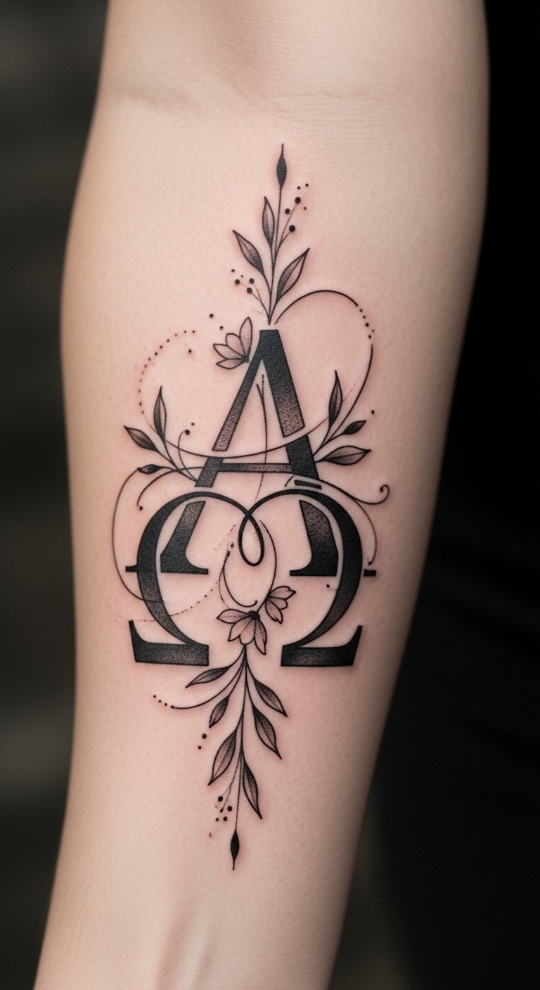 Embracing the Alpha and Omega on the forearm signifies a strong connection to God’s eternal nature, serving as a daily reminder of His presence in your life.